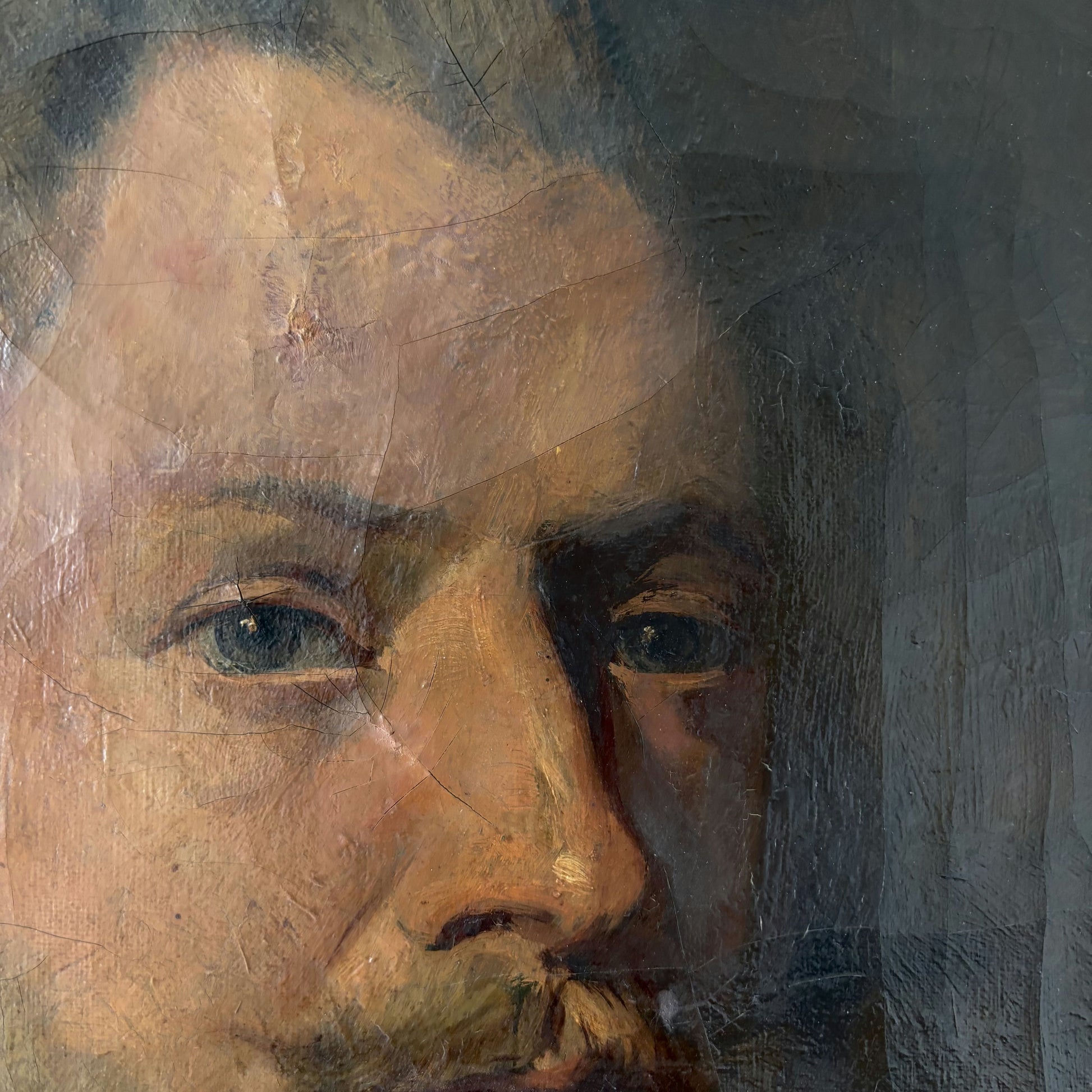 This authentic, hand-painted original Oil Painting from the 19th Century features a distinguished gentleman rendered in rich, naturalistic tones. The visible surface texture showcases expressive brushwork, particularly evident in the depth of the background and the lifelike qualities of the subject’s face and attire. Subtle craquelure and well-aged canvas edges underscore the painting’s unique provenance and historical character. As a one of a kind work of art, this portrait offers not only a glimpse into 19th Century artistry but also a truly singular presence for any collection.