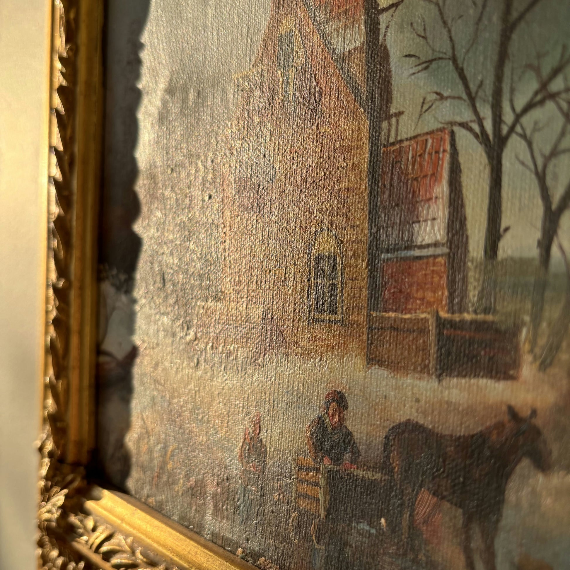 This is an authentic, hand-painted, original oil painting capturing the charm of a 19th Century winter landscape. The scene depicts figures enjoying a frozen river beneath dramatic cloud-filled skies, surrounded by windmills and a rustic house, evoking a sense of timeless rural life. The artist’s brushwork is evident on the textured surface, lending depth and movement to the snow, trees, and flowing garments. This artwork is truly one of a kind, offering collectors a unique glimpse into a bygone era through skilled, detailed craftsmanship.