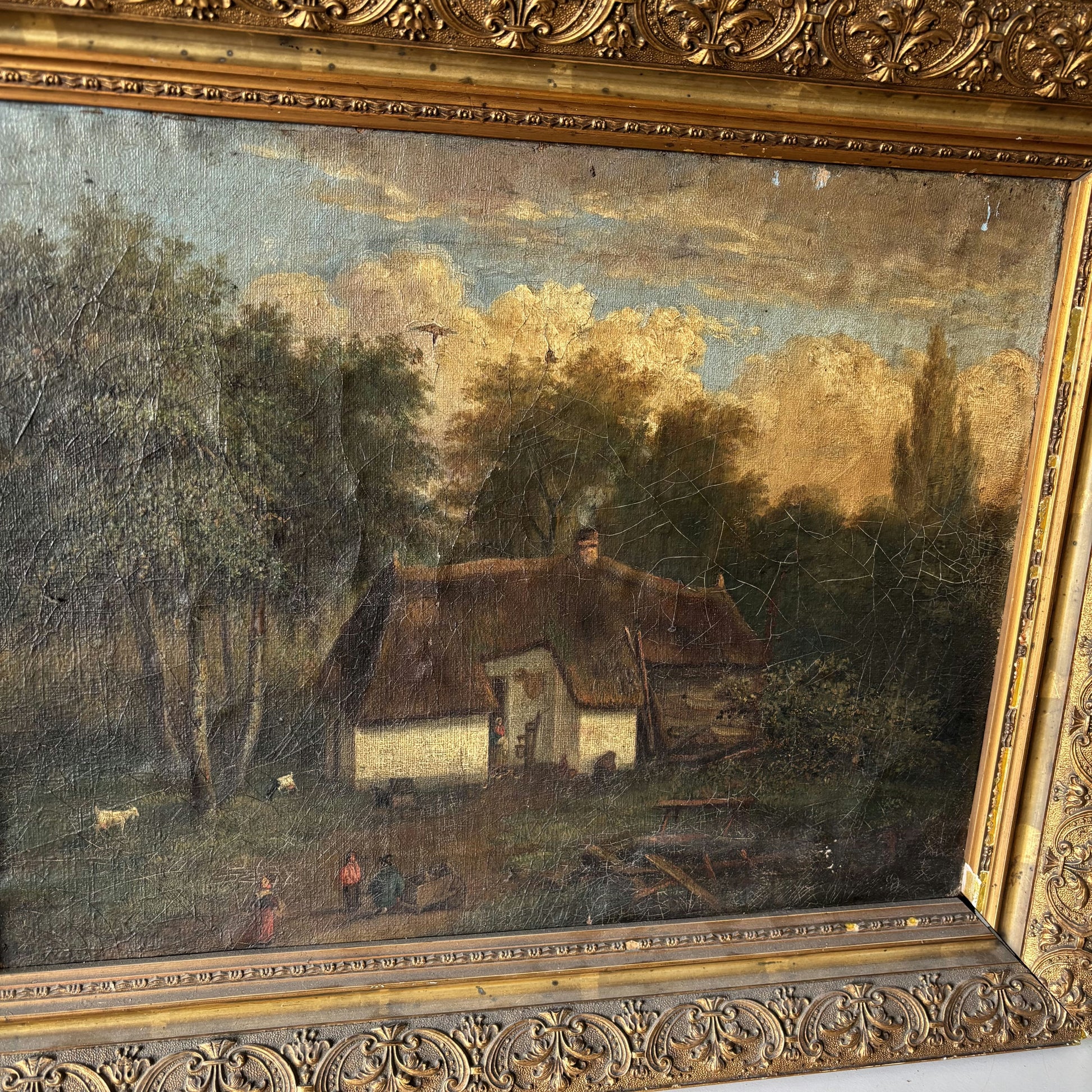 This authentic, hand-painted, original oil painting from the early 20th Century beautifully captures a tranquil rural scene, featuring a thatched-roof cottage nestled among tall trees and under a sky filled with golden clouds. Visible in the foreground are tiny figures and grazing animals, rendered with delicate brushstrokes that give the surface a subtle, textured quality. The artwork’s brushwork and aged patina emphasize its genuine vintage character, showcasing the artist's masterful handling of light and detail. This one-of-a-kind piece.