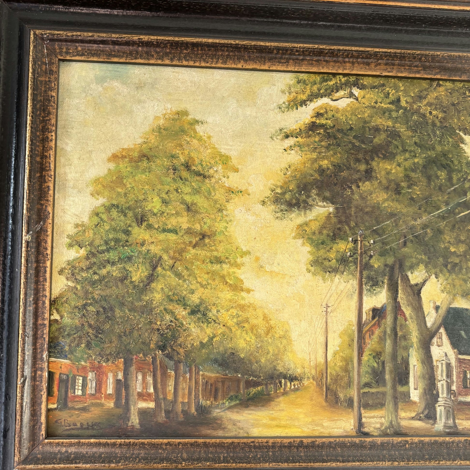 This authentic, hand-painted original Oil Painting from the Mid 20th Century beautifully captures a tranquil street scene lined with tall, leafy trees and charming houses bathed in warm light. Visible, expressive brushwork enhances the texture of the foliage and pathway, lending depth and vibrancy to the composition. Fine details, such as utility poles and classic architecture, evoke a timeless and nostalgic atmosphere. As a one of a kind artwork, this piece offers both historical character and unique artistry for the discerning collector.