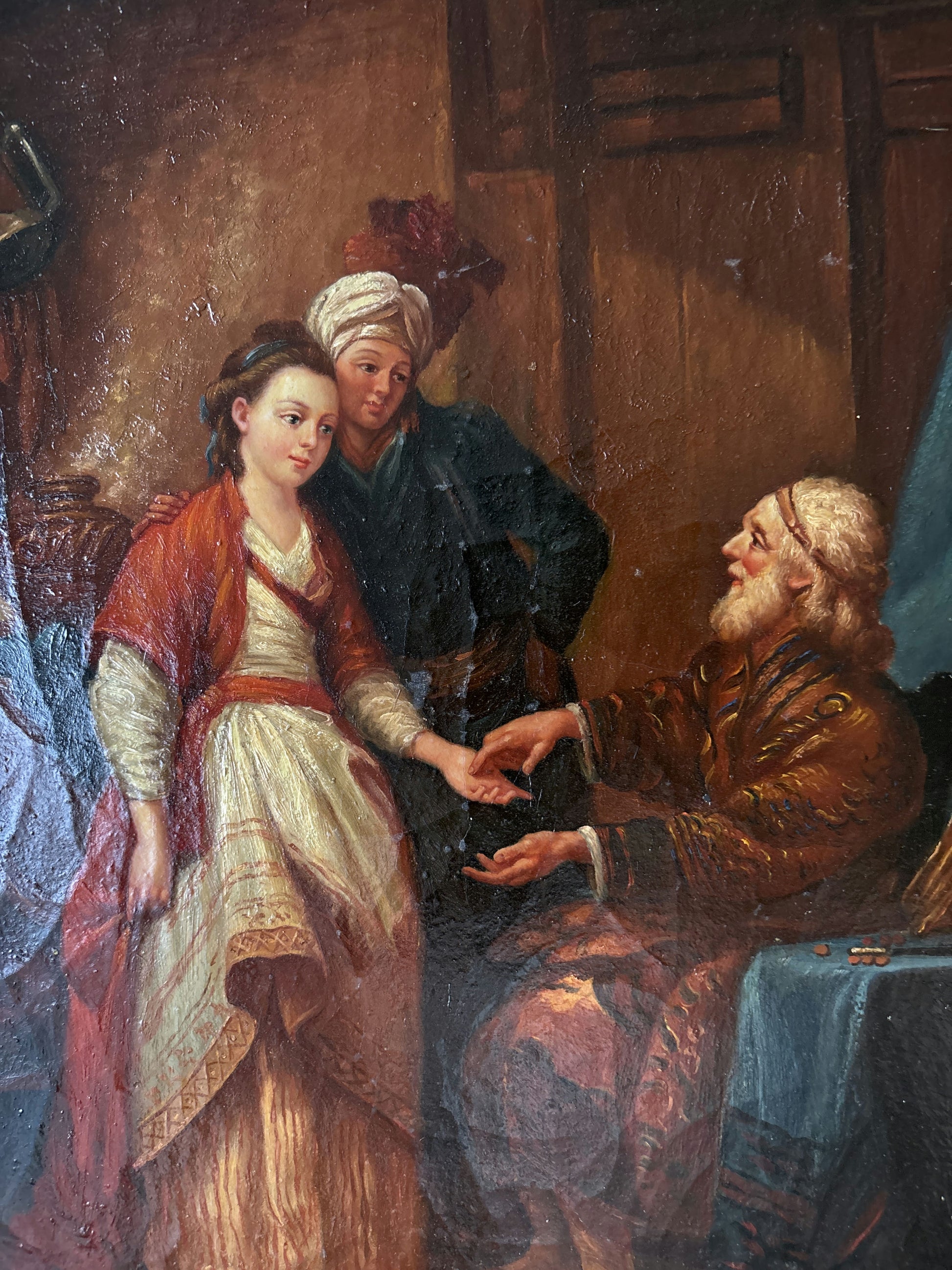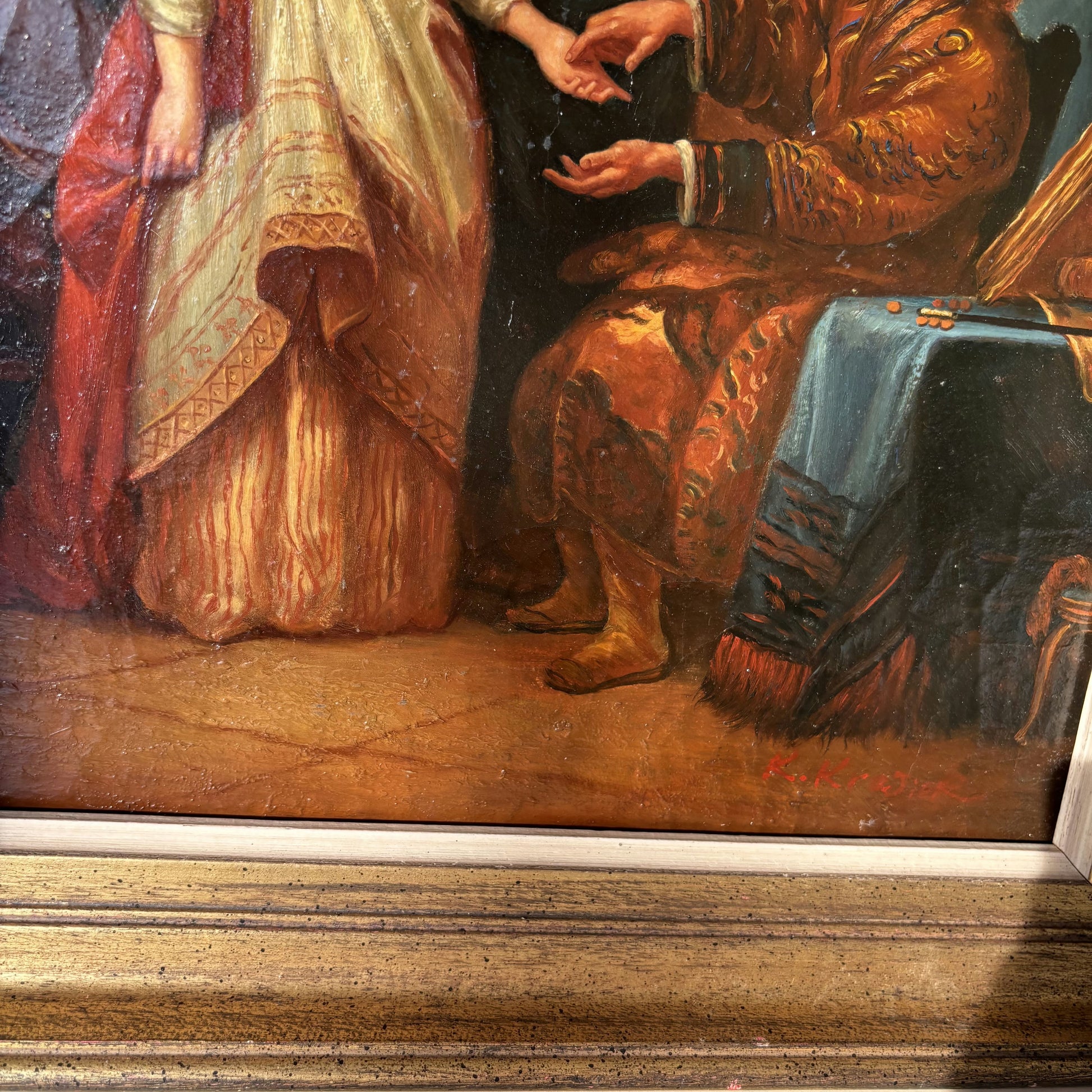 This is a marvelous hand-painted oil painting made around 1980 in France, it beautifully captures an intimate scene featuring three figures in period attire, engaged in a moment of gentle interaction. The composition draws the viewer into a warmly lit interior, where the rich textures of the garments and the subtle highlights on their faces and hands reveal the artist’s accomplished brushwork. Visible brushstrokes add a dynamic quality to the surface, enhancing the artwork’s sense of depth and realism.