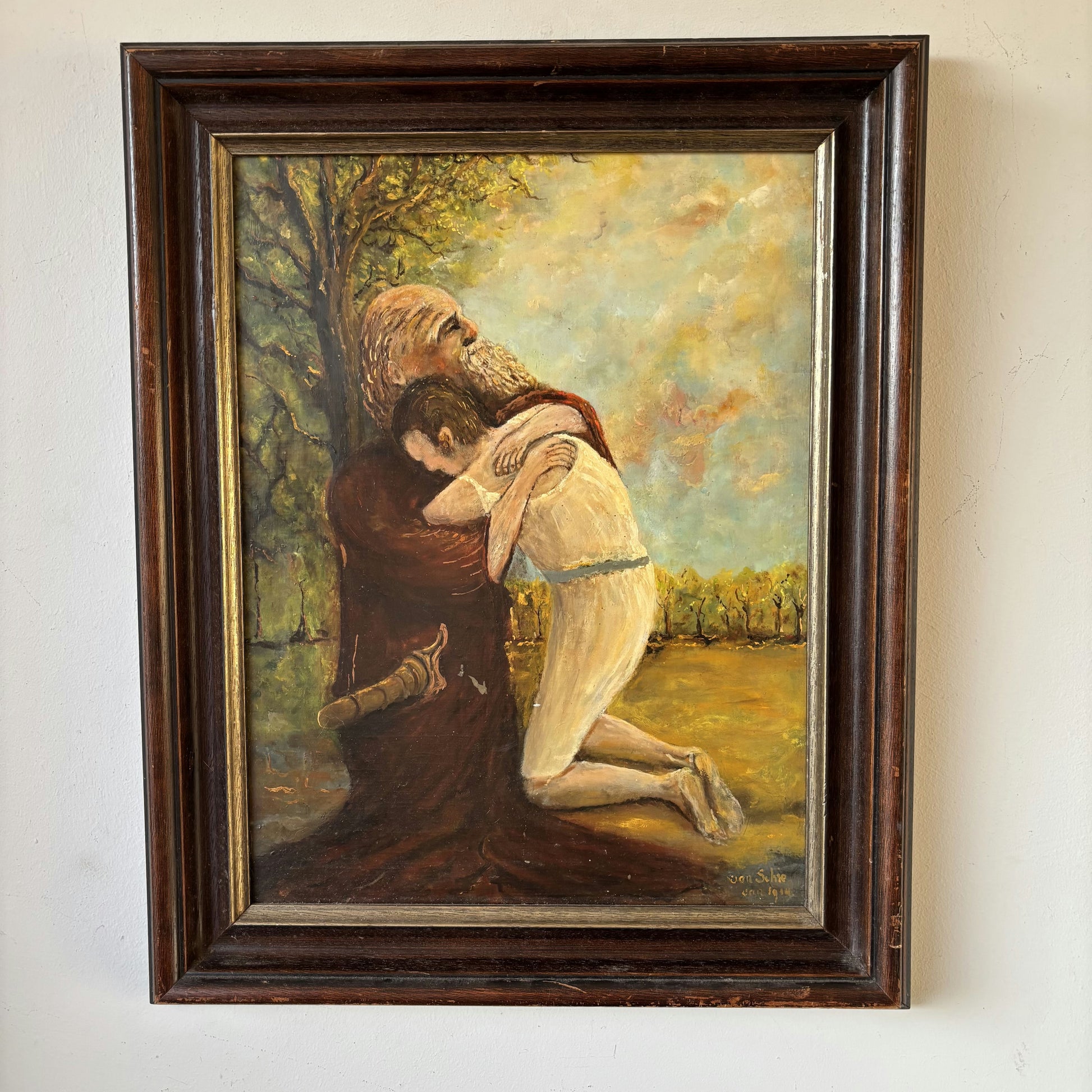 This authentic, hand-painted Oil Painting from the Early 20th Century captures a deeply emotional embrace between two figures, set beneath tall trees and a softly glowing sky. The artist’s expressive brushwork brings a sense of movement and warmth, especially evident in the richly textured background and the intricate detailing of the figures’ hair and garments. The unique surface vitality reflects the individual strokes of the painter, underscoring the work’s originality. This one of a kind artwork is a true collector’s piece, offering both historical value and heartfelt artistry.