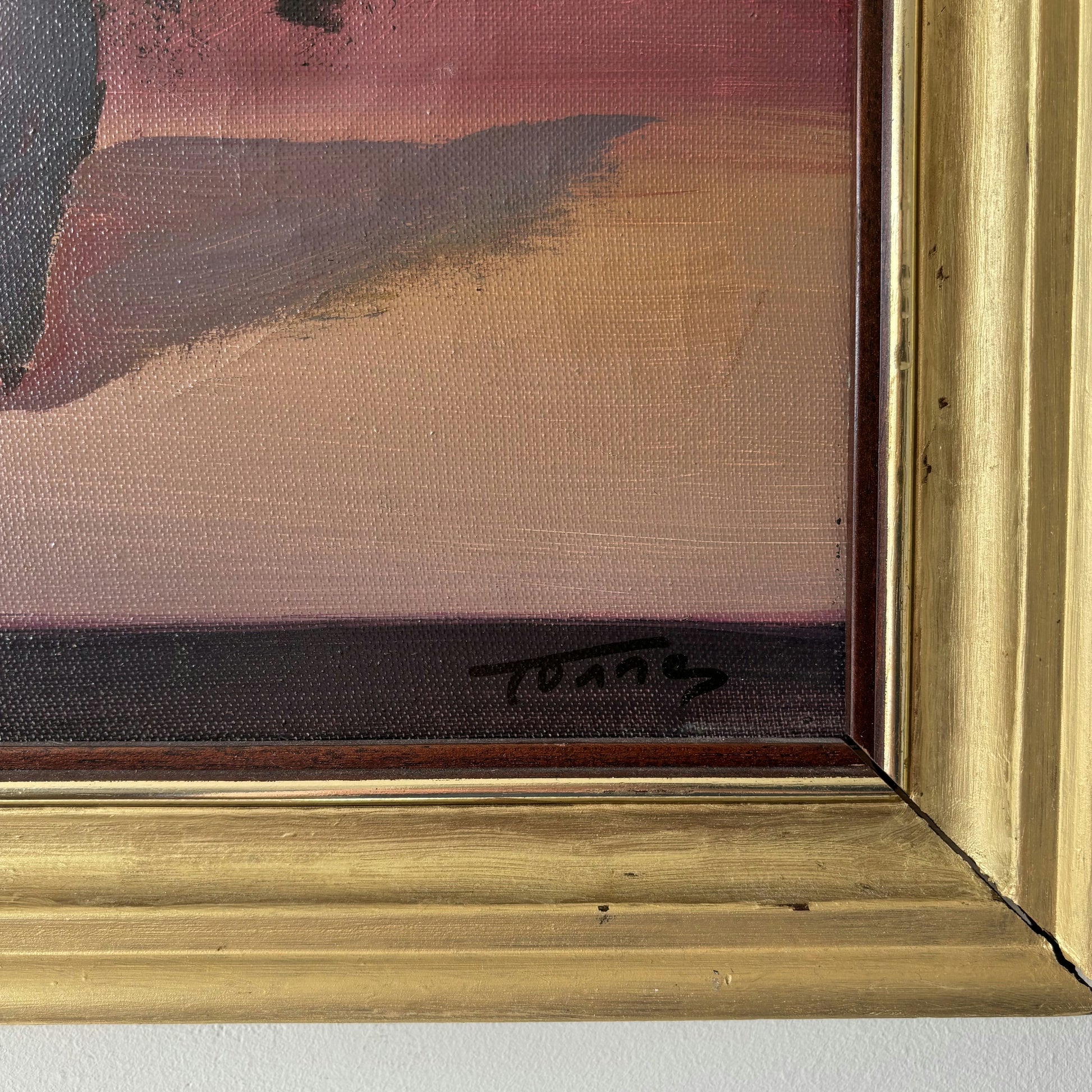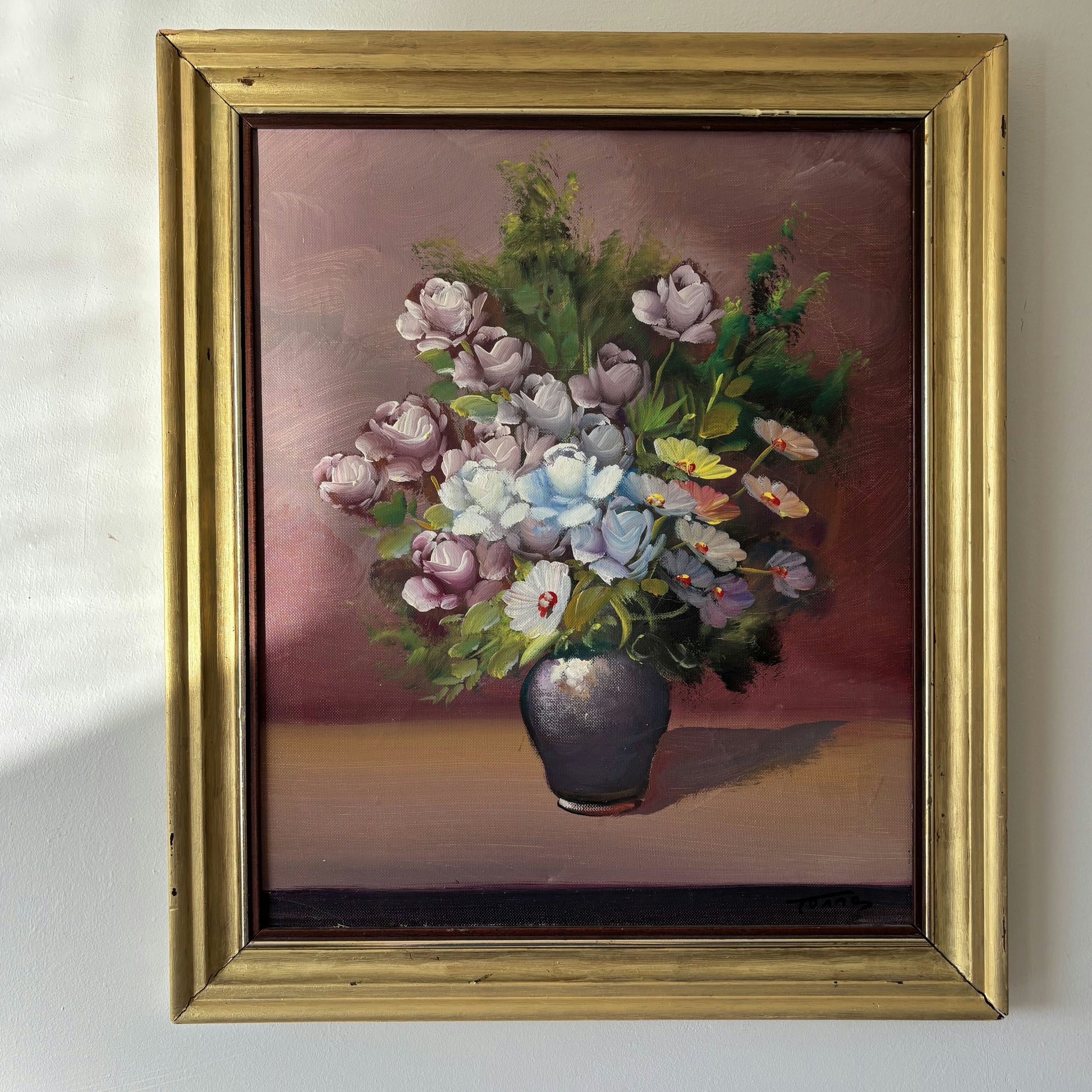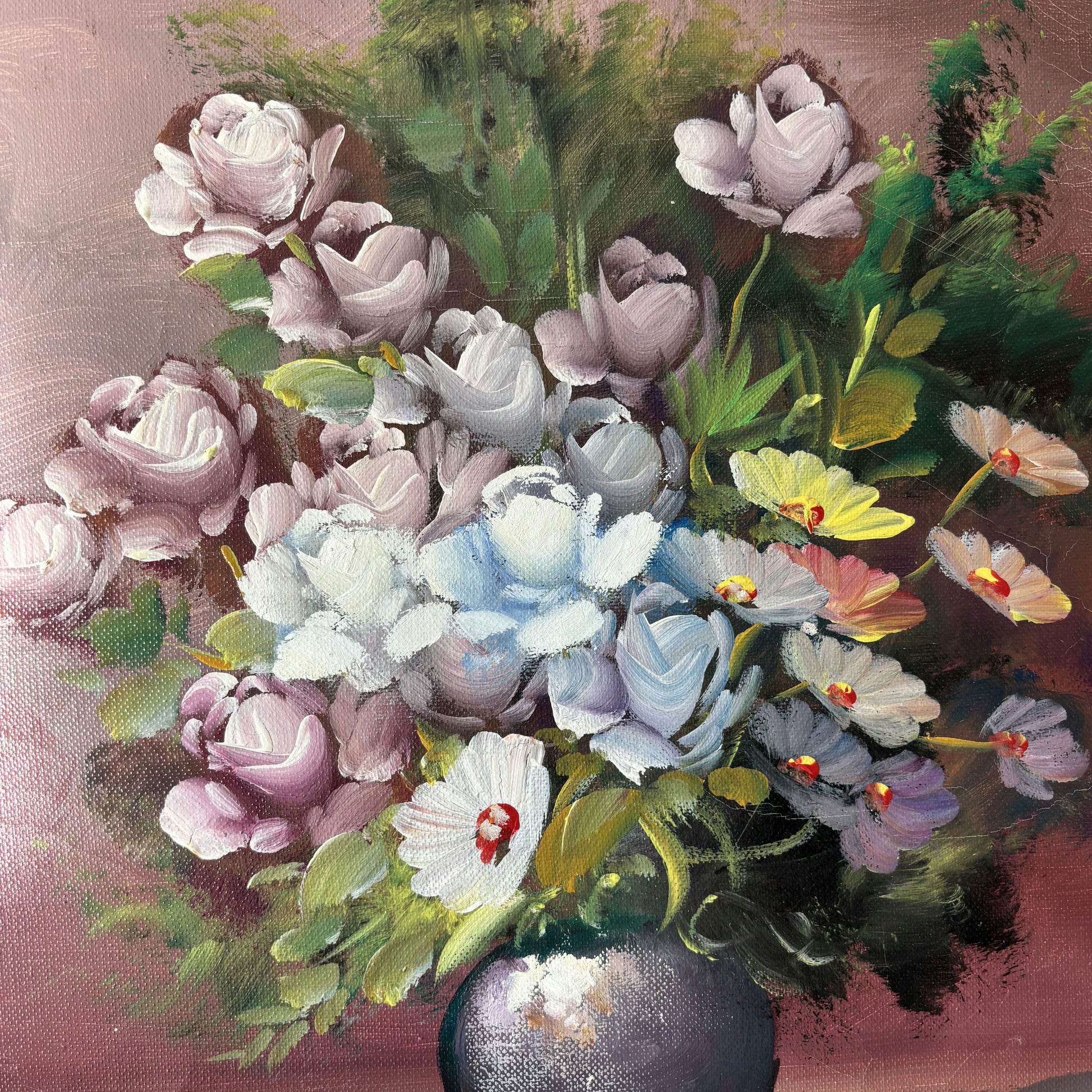 This authentic, hand-painted original oil painting from the Mid 20th Century beautifully captures a vibrant bouquet of flowers in a rounded vase, set against a softly blended mauve and pink background. The artist’s expressive brushwork gives depth and texture to each individual petal and leaf, highlighting the artwork’s lively surface quality and unique character. Subtle highlights and shadows play across the composition, while delicate layers of color bring the blossoms to life. This one-of-a-kind piece is an excellent example of genuine artistry, perfect for collectors seeking a truly original and timeless floral painting.