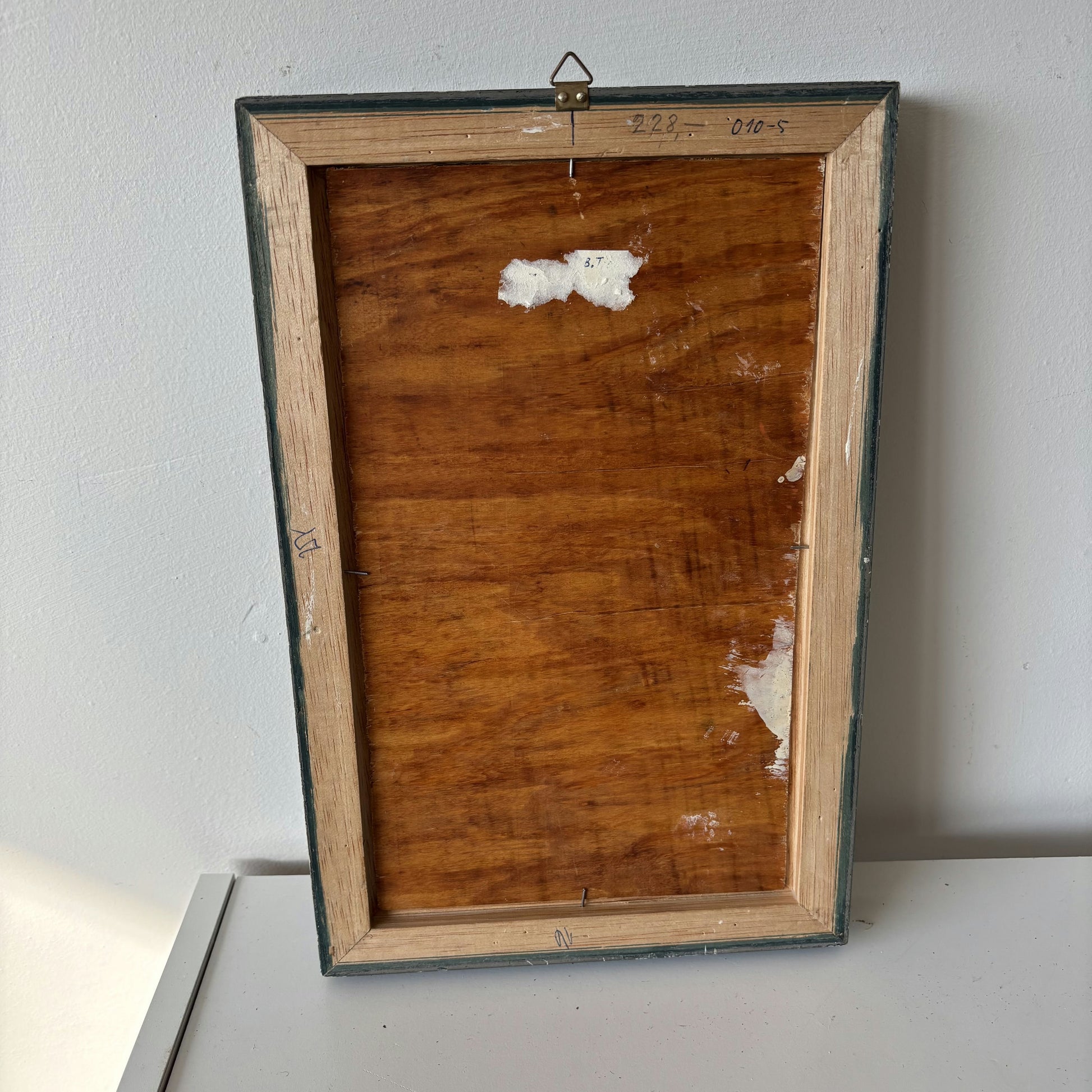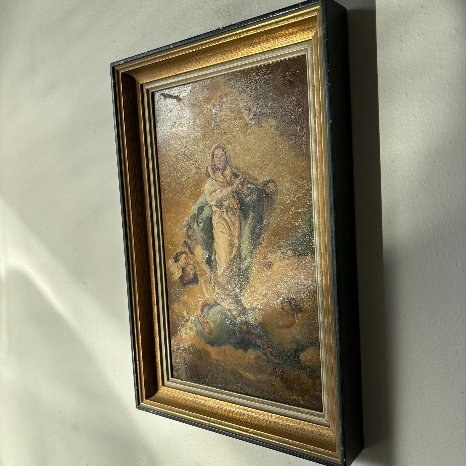 This authentic, hand-painted oil painting from the Mid 20th Century depicts a serene religious figure surrounded by cherubic angels and golden clouds, with a dove gracefully hovering above. The artist's expressive brushwork is visible in the soft blending of the background and the delicate rendering of figures, adding both texture and depth to the surface. Signed and dated in the lower right, this original artwork is truly one of a kind, offering a warm spiritual presence and classic beauty. The luminous tones and carefully composed scene make this piece a remarkable example of vintage devotional art.