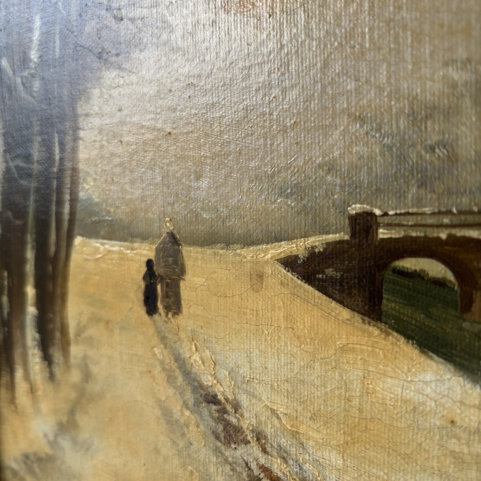 A beautiful vintage winter landscape showing a quiet country road lined with leafless trees, softly illuminated by cold seasonal light. The artist captured the stillness of winter with gentle, muted tones and careful brushwork. The scene has a peaceful, nostalgic atmosphere—perfect for creating a calm, cozy feeling in any room.