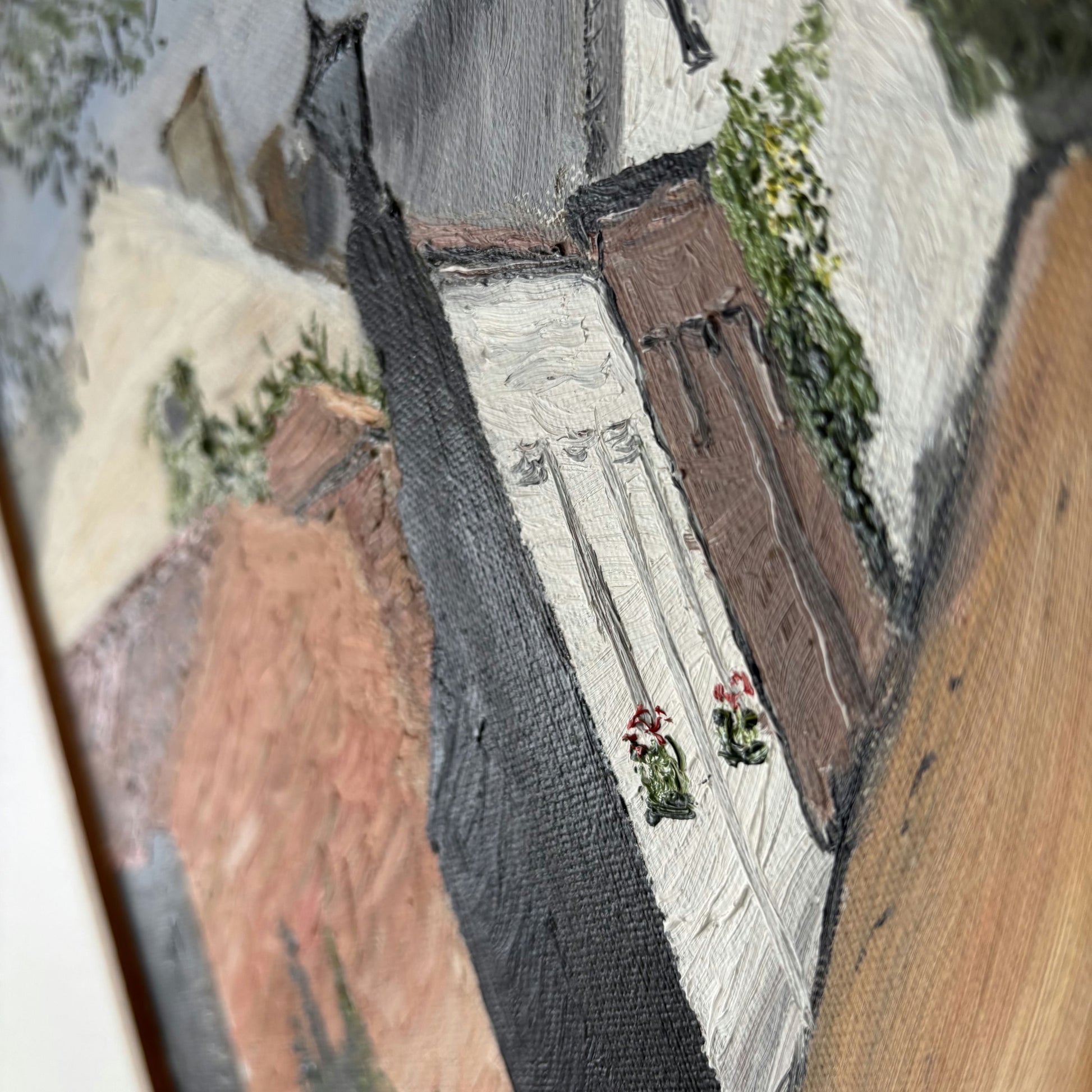 This authentic, hand-painted original Oil Painting from the late 20th Century beautifully captures a tranquil village street leading toward a tall, stone church tower beneath a softly clouded sky. The brushwork adds a tactile quality to the textured rooftops and leafy branches that partially frame the composition, while lively touches of greenery and flower boxes bring hints of color and detail to the scene. Visible impasto strokes add dimension to both shadow and light, particularly on the buildings and cobblestone street. As a one-of-a-kind artwork, this piece offers a unique and atmospheric glimpse into a quiet, timeless moment.