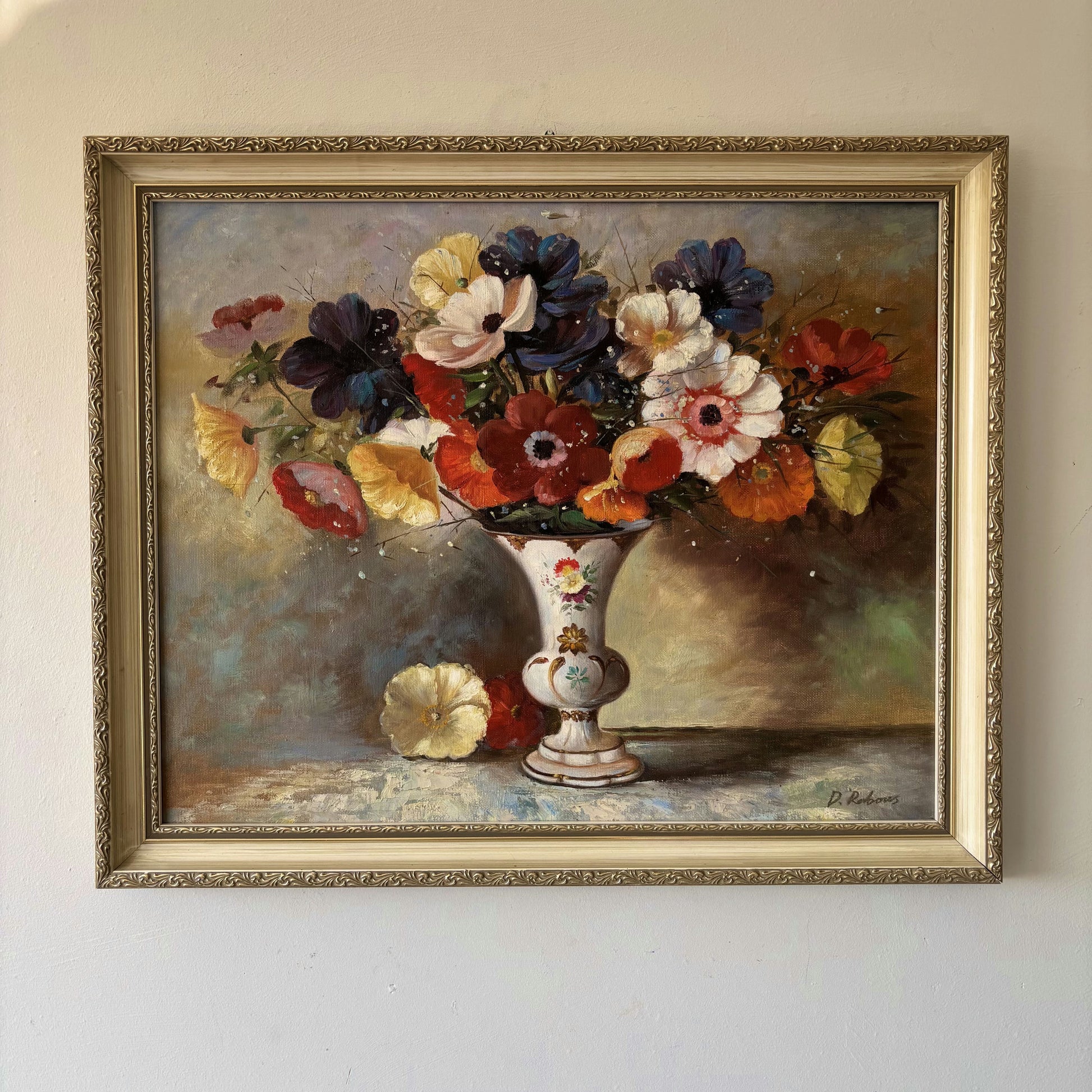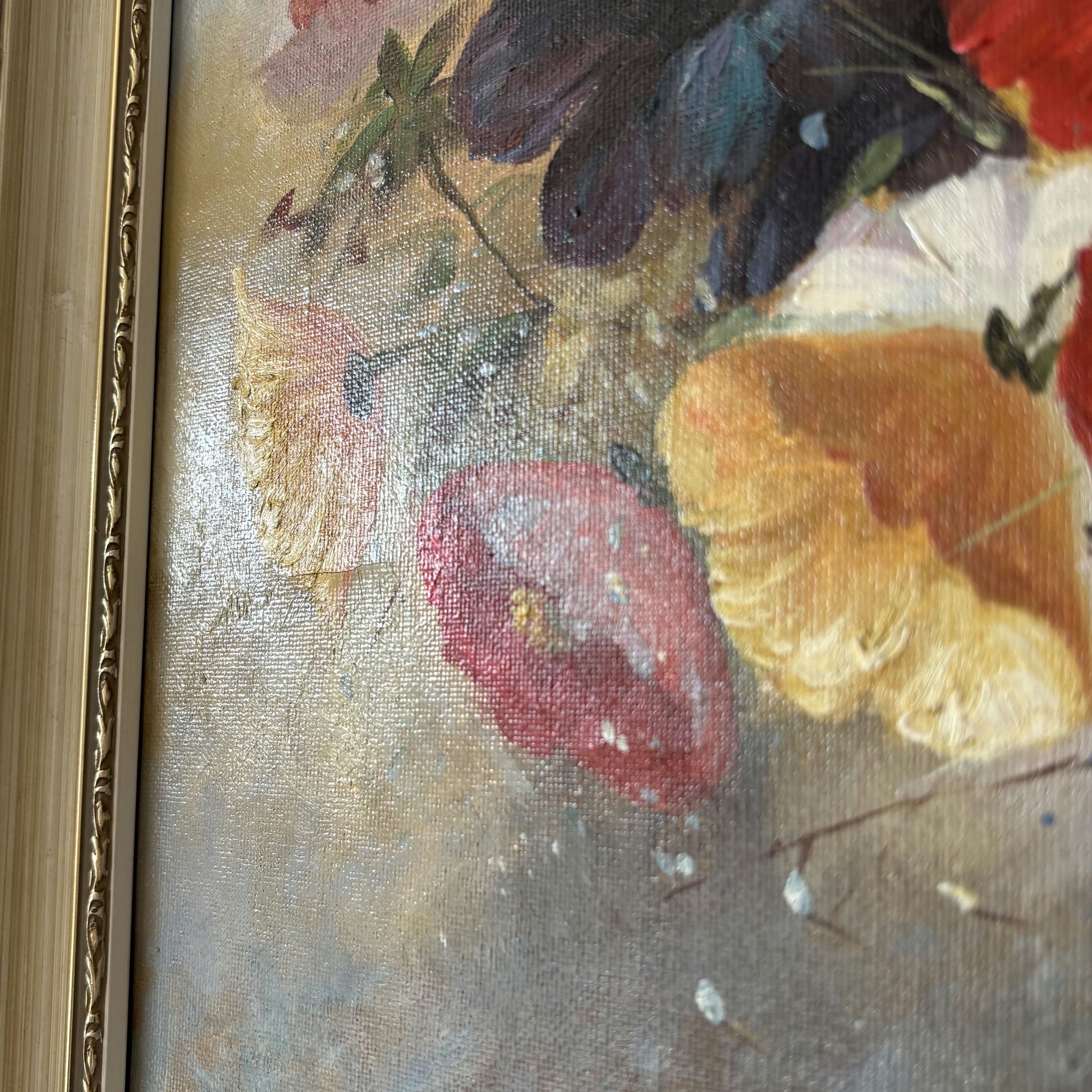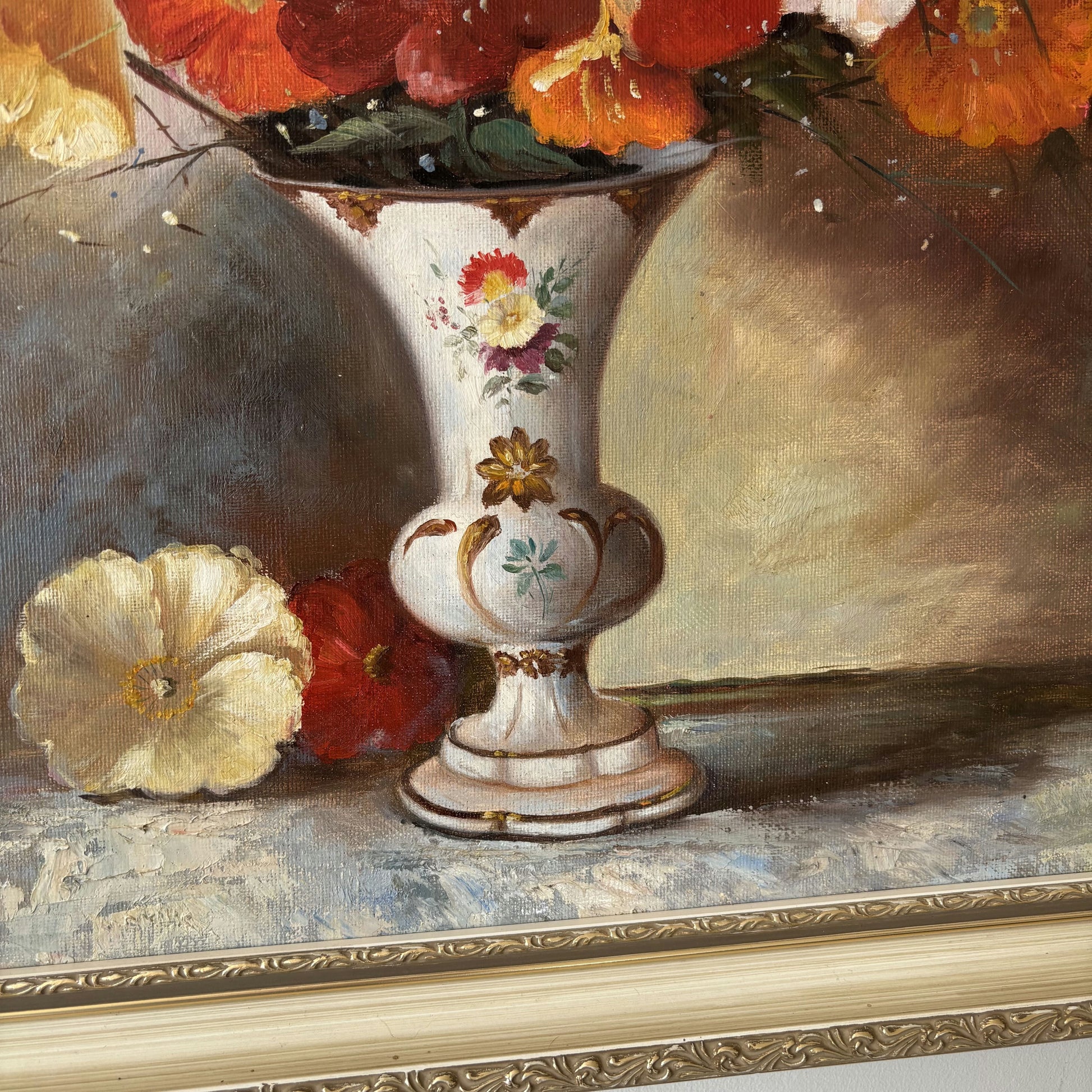 This authentic, hand-painted original oil painting from the Mid 20th Century beautifully depicts a vibrant bouquet of flowers arranged in an ornate vase. Each blossom, rendered in vivid reds, yellows, and purples, stands out against a softly blended background.