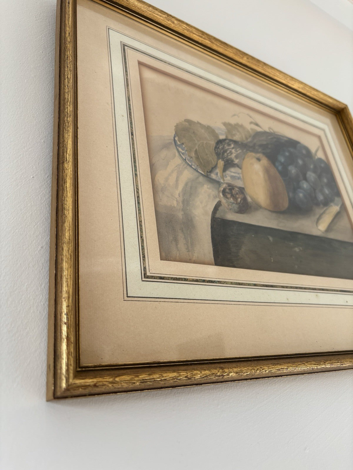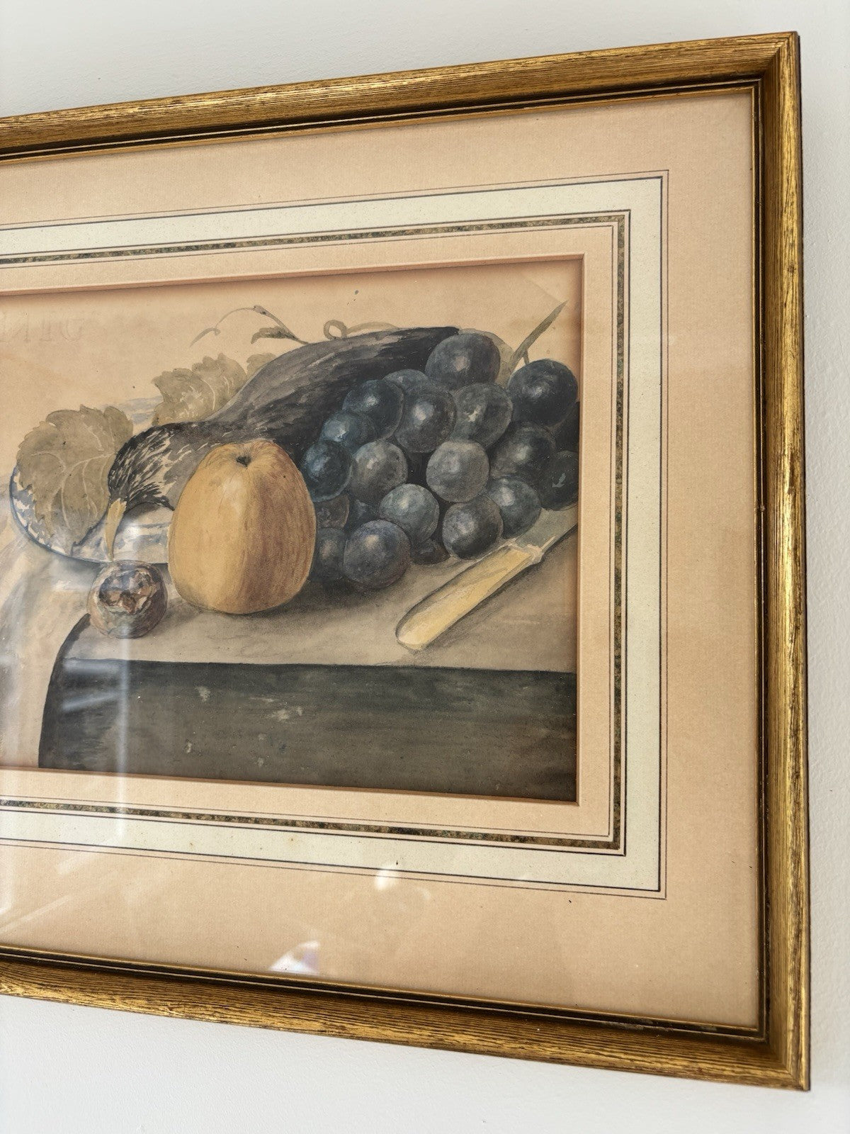 “FRUIT AND GRAPES” Vintage Hand-Painted Still Life Framed Art Drawing Art