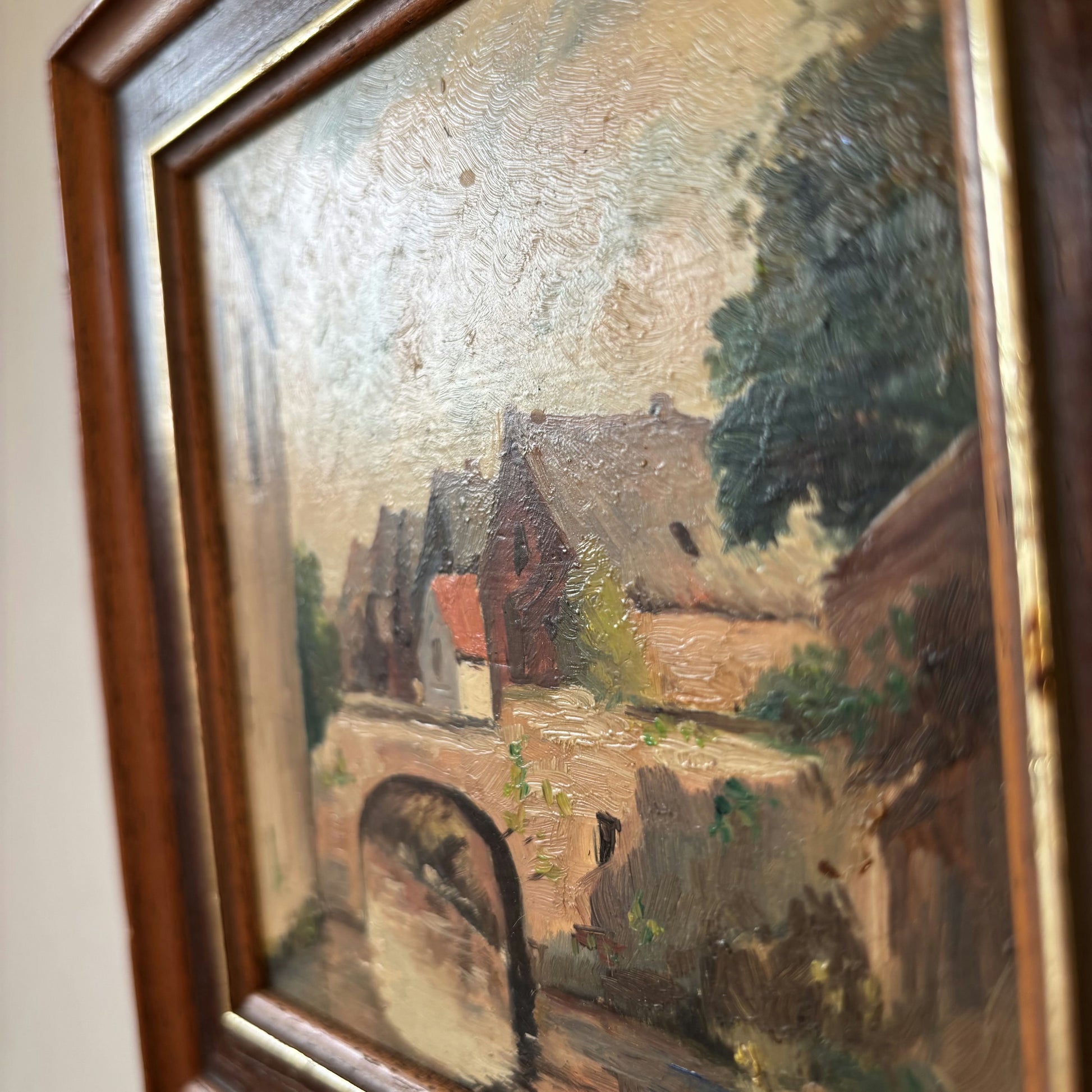 This authentic, hand-painted original Oil Painting from the Mid 20th Century beautifully depicts a serene village scene featuring a stone bridge, charming red-roofed houses, and lush greenery reflected on calm water. The carefully layered brushwork adds texture and depth to the sky, rooftops, and foliage, bringing the tranquil setting to life. Subtle variations in color and confident strokes on the surface enhance the unique character of the composition. As an original work of art, this piece is truly one of a kind and offers collectors a remarkable glimpse into the artistry of its era.