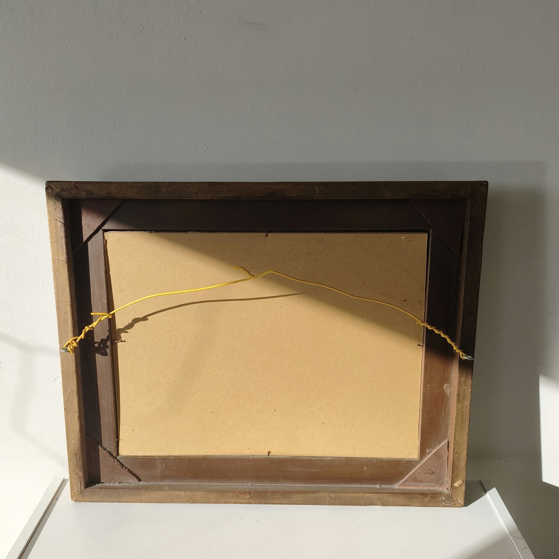 This is an authentic, hand-painted, original Oil Painting from the Mid 20th Century, capturing a serene natural scene with remarkable detail. The artwork depicts a majestic bald eagle attending to its nest perched high on a tree, with two blue eggs nestled securely among branches and autumnal foliage, set against a gentle sky. Distinctive, textured brushwork brings depth to both the eagle's feathers and the intricate surface of the nest, making the scene come alive. This one-of-a-kind piece beautifully combines rich color and expressive technique, offering a unique and timeless addition to any art collection.
