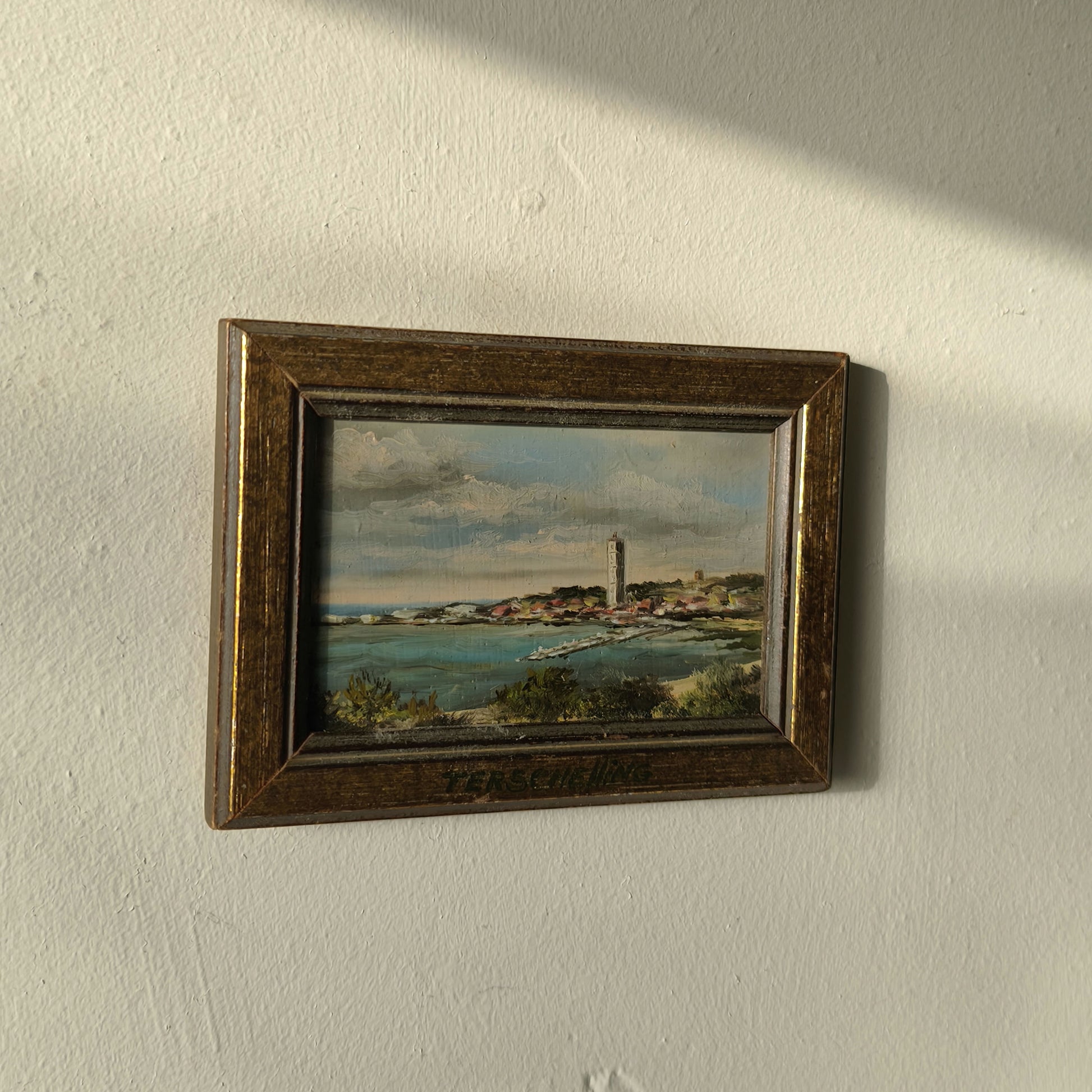 A charming Dutch miniature oil painting depicting the island of Terschelling, with its iconic lighthouse and sweeping coastal views. The artist’s fine brushwork and soft palette evoke the tranquil beauty of the Wadden Sea landscape.
