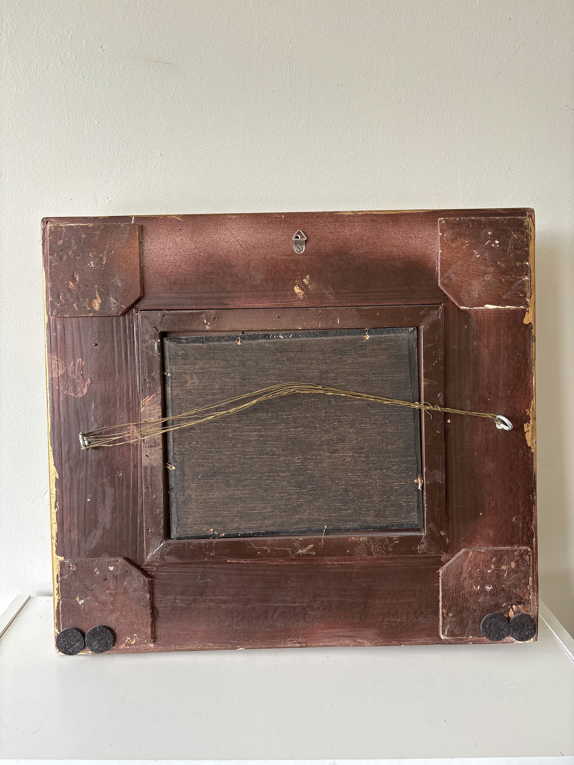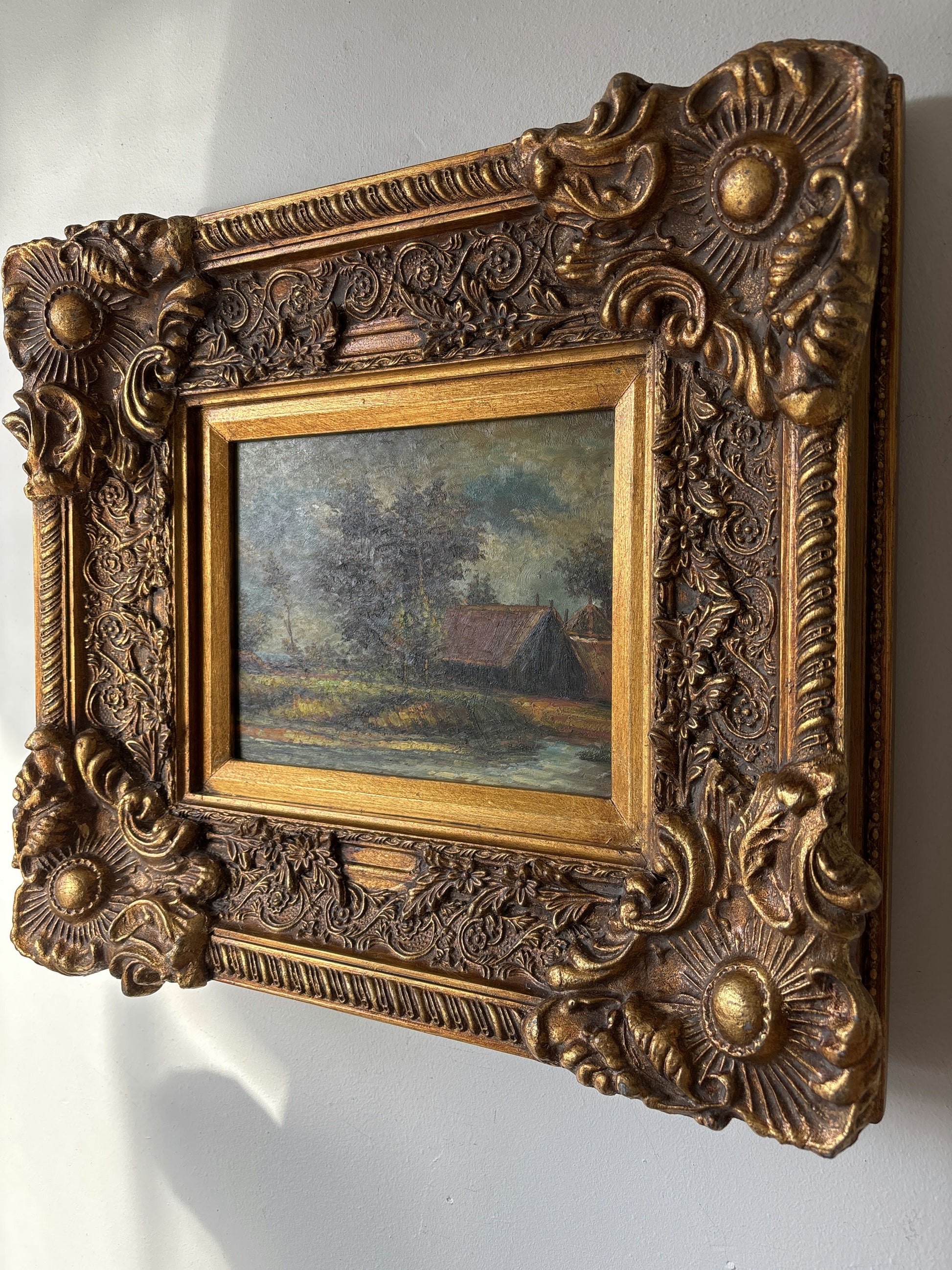 This authentic, hand-painted original oil painting, presumably from the early 20th century, captures a tranquil rural scene with rustic buildings nestled beside a reflective stream and shaded by mature trees. The artwork features visible, expressive brushwork that adds depth and texture to the vibrant landscape, enhancing the surface with both energy and subtlety. The sky is rendered with soft, swirling strokes, suggesting an atmospheric quality unique to the artist’s vision. This one-of-a-kind piece offers timeless charm, bringing an inviting sense of nostalgia and artistry to any collection.