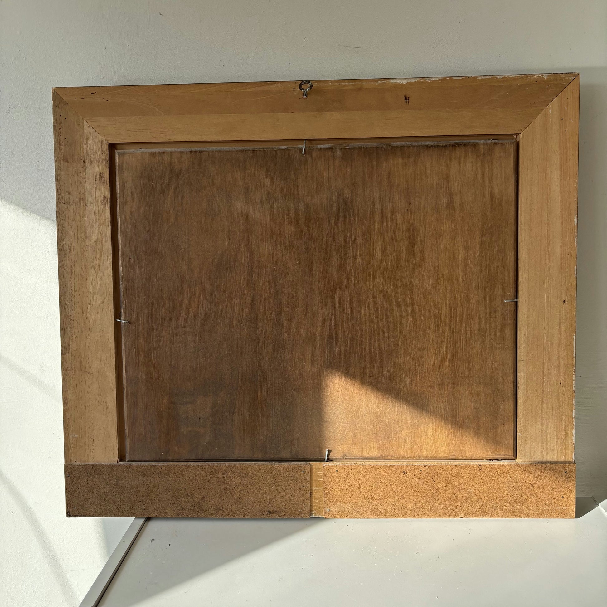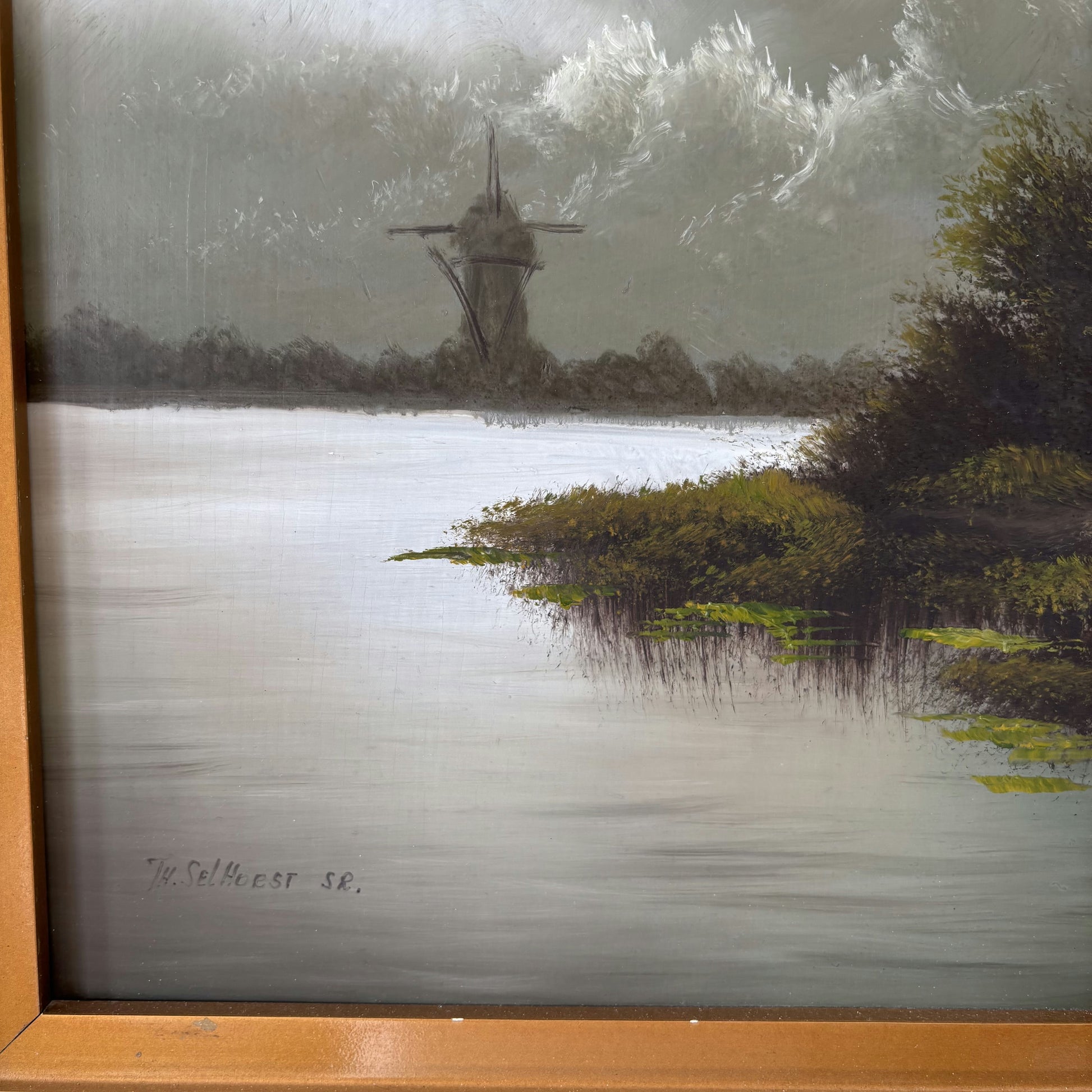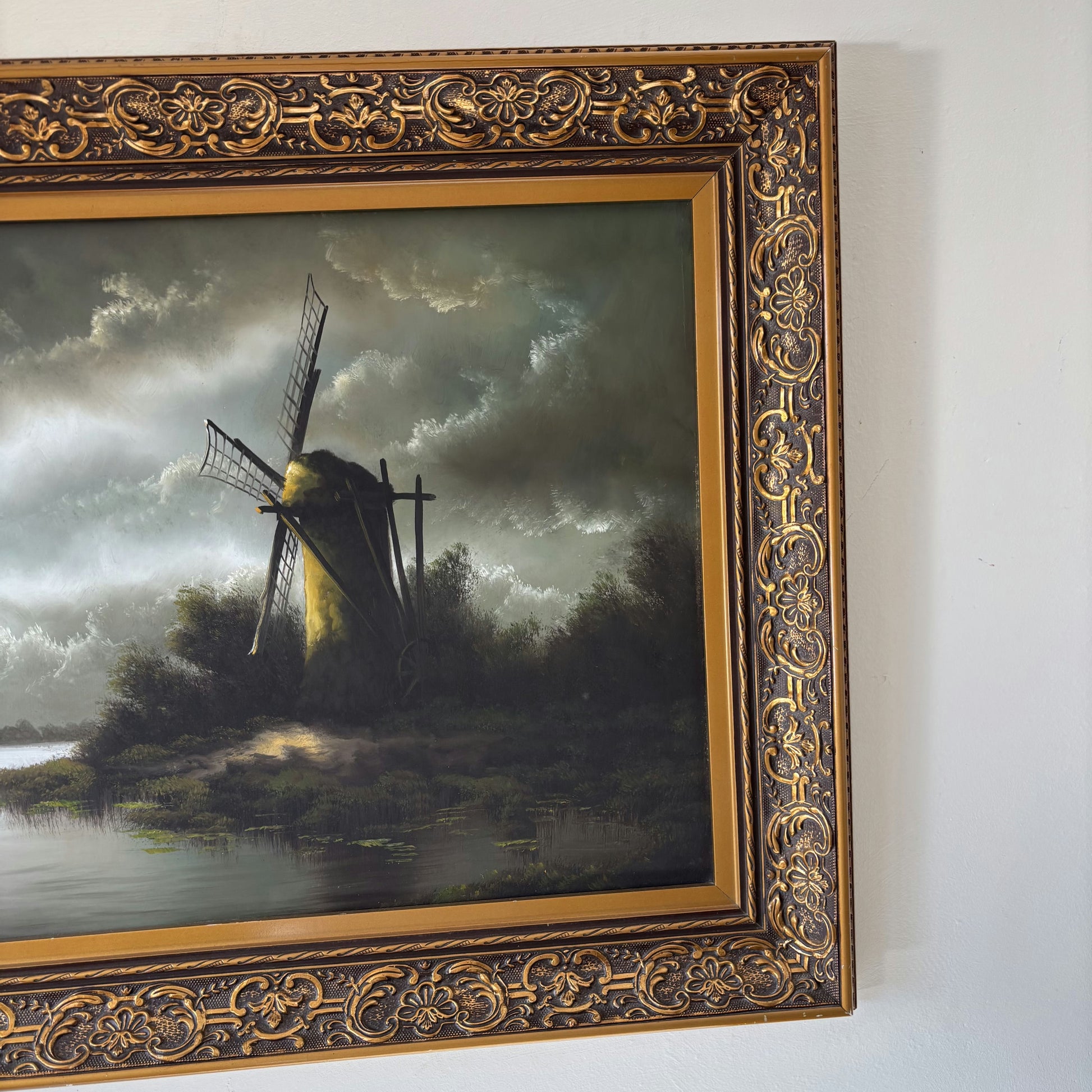 This authentic, hand-painted oil painting from the Mid 20th Century beautifully captures a tranquil landscape featuring an old windmill beside a calm body of water under dramatic, cloud-filled skies. The visible brushwork lends depth and subtle texture to the clouds and foliage, enhancing the atmosphere of the scene. Every stroke showcases the artist's attention to detail, creating a lifelike yet moody depiction of the Dutch countryside. As an original work, this oil painting is truly one of a kind and offers a distinctive piece of art history for any collection.