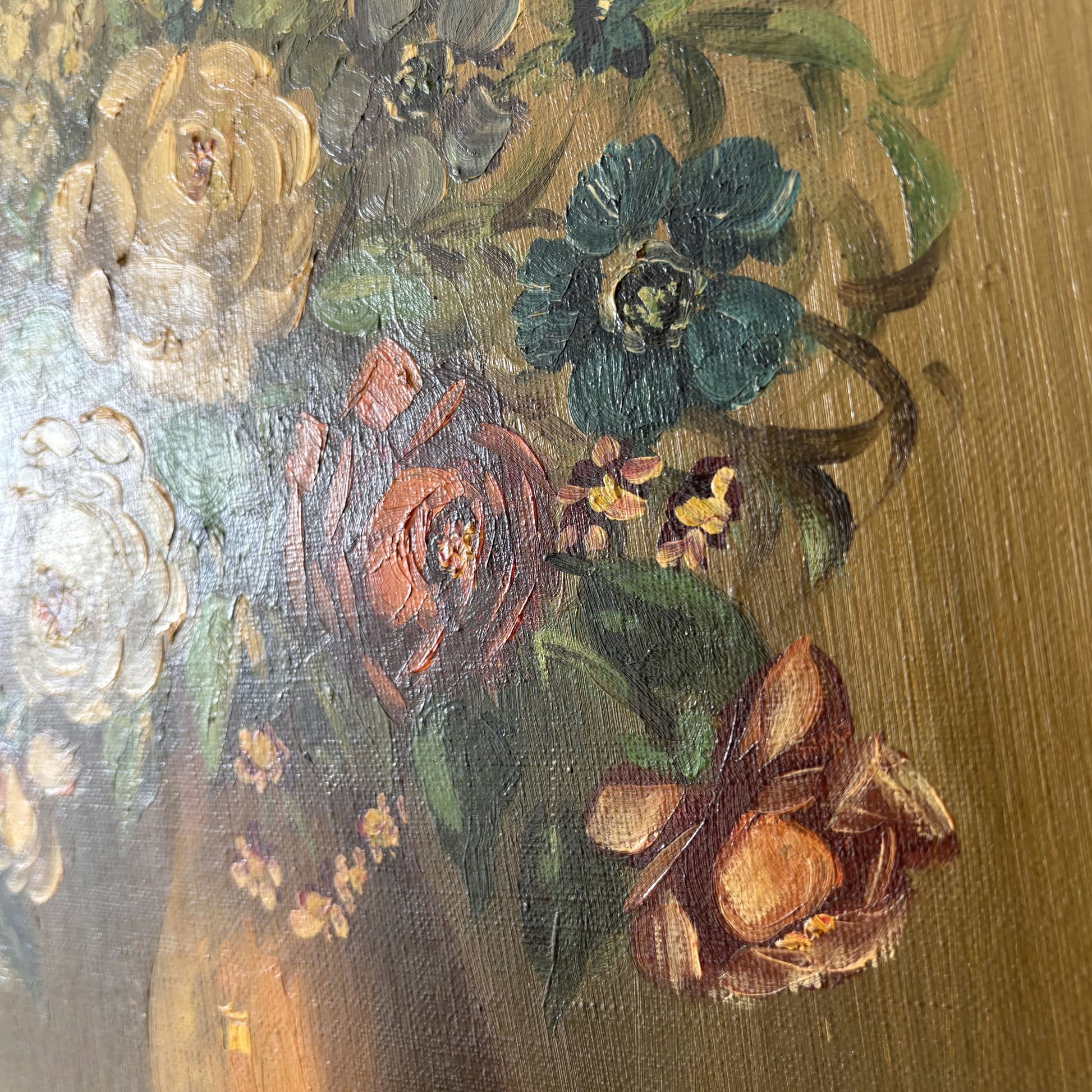 This is an authentic, hand-painted, original Oil Painting from the Early 20th Century, featuring a beautifully arranged bouquet of flowers in a golden vase set against a neutral background. The artist's expressive brushwork creates a lively surface, particularly evident in the sculptural petals and lush green leaves. Scattered rose petals bring an added sense of naturalism to the composition, while rich, earthy tones give the artwork timeless appeal. As a unique, one of a kind piece, it showcases classic craftsmanship and offers a glimpse into the artistic sensibilities of its era. Artist: Rosa. Early 20th Century. The painting measures 40 × 50 cm (15.7 × 19.7 inches) and weighs 1.1 kg (2.4 lbs). The frame shown in the photos is included.