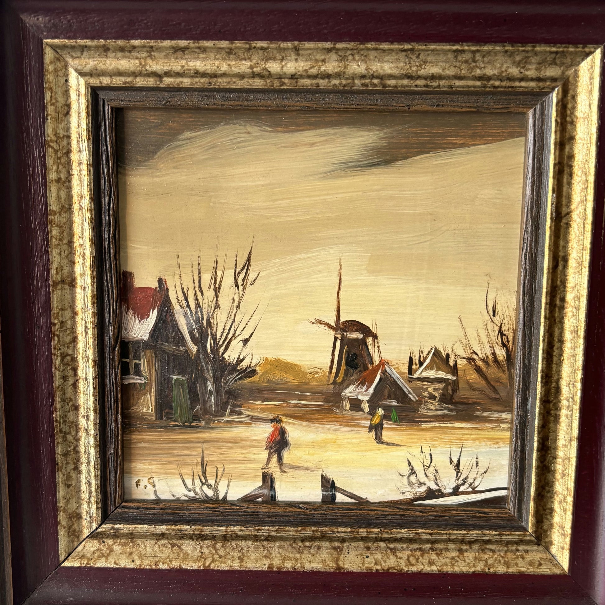 This is an authentic, hand-painted, original oil painting, presumably from the mid 20th century, showcasing a tranquil rural village scene. The composition features several rustic houses, a central windmill, and two small figures walking along a wintry path, all rendered with expressive, visible brushwork that adds texture and depth to the surface. Bare trees and muted skies contribute to a calm, atmospheric setting captured beautifully in oil. This artwork is truly one of a kind, making it a unique addition to any collection seeking genuine and original pieces.