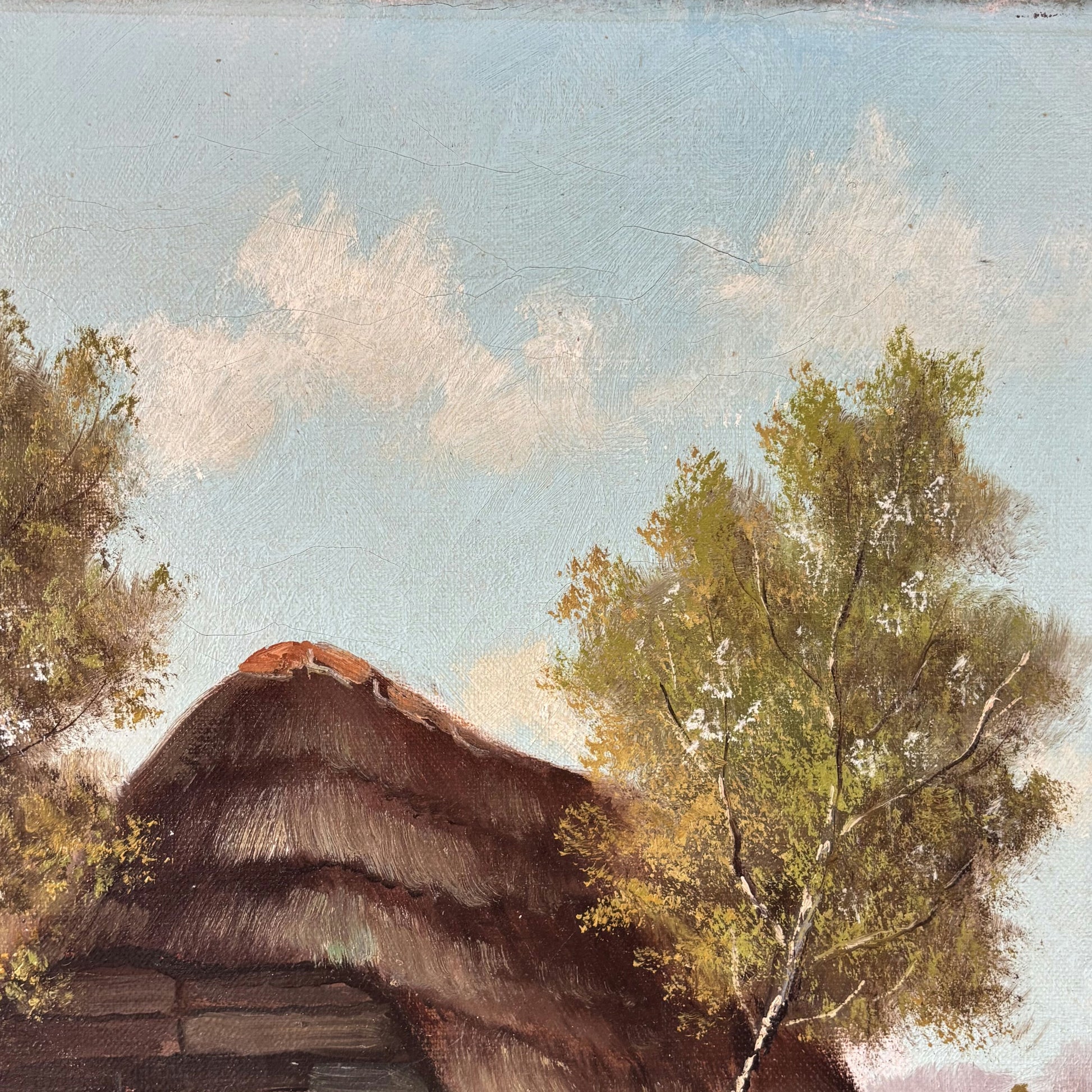 This is an authentic, hand-painted, original Oil Painting from the Late 20th Century, capturing a tranquil rural landscape. The artwork features a shepherd standing by a rustic thatched-roof barn, with a flock of sheep grazing nearby under the gentle shade of tall, leafy trees. Delicate and textured brushwork brings the vibrant greenery, expansive purple fields, and light-filled sky to life, enhancing the sense of depth and movement across the canvas. The scene’s inviting path winding through the fields further emphasizes its unique, one-of-a-kind artistry, making it a distinctive piece for any collection.