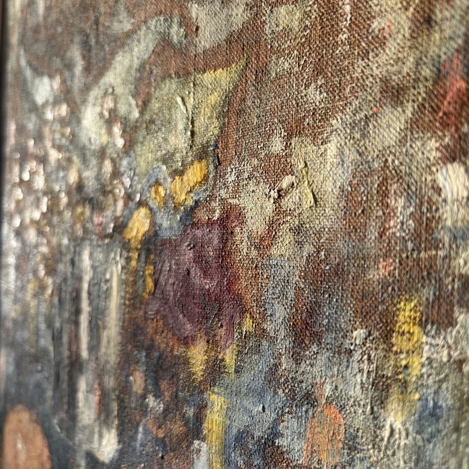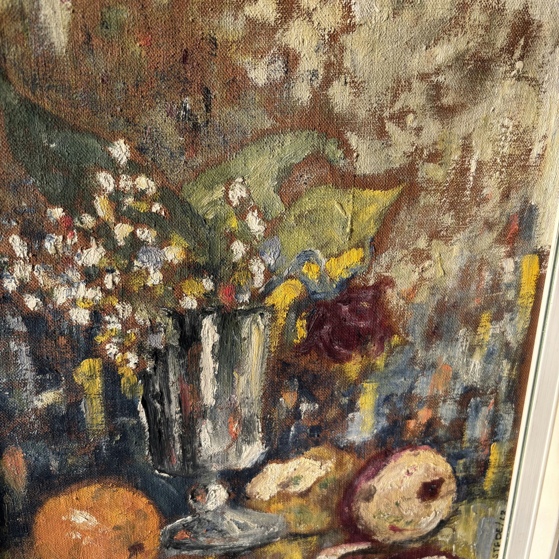 This is an authentic, hand-painted, original oil painting, presumably from the early 20th century. The artwork features a vibrant still life arrangement with a silver-toned vessel filled with delicate white and yellow blooms, surrounded by fruit in warm hues of orange, red, and cream. Distinctive, textural brushwork brings depth and movement to the surface, highlighting the artist's expressive technique. Each detail is rendered with rich, layered colors, making this one-of-a-kind piece a striking and timeless addition to any collection.