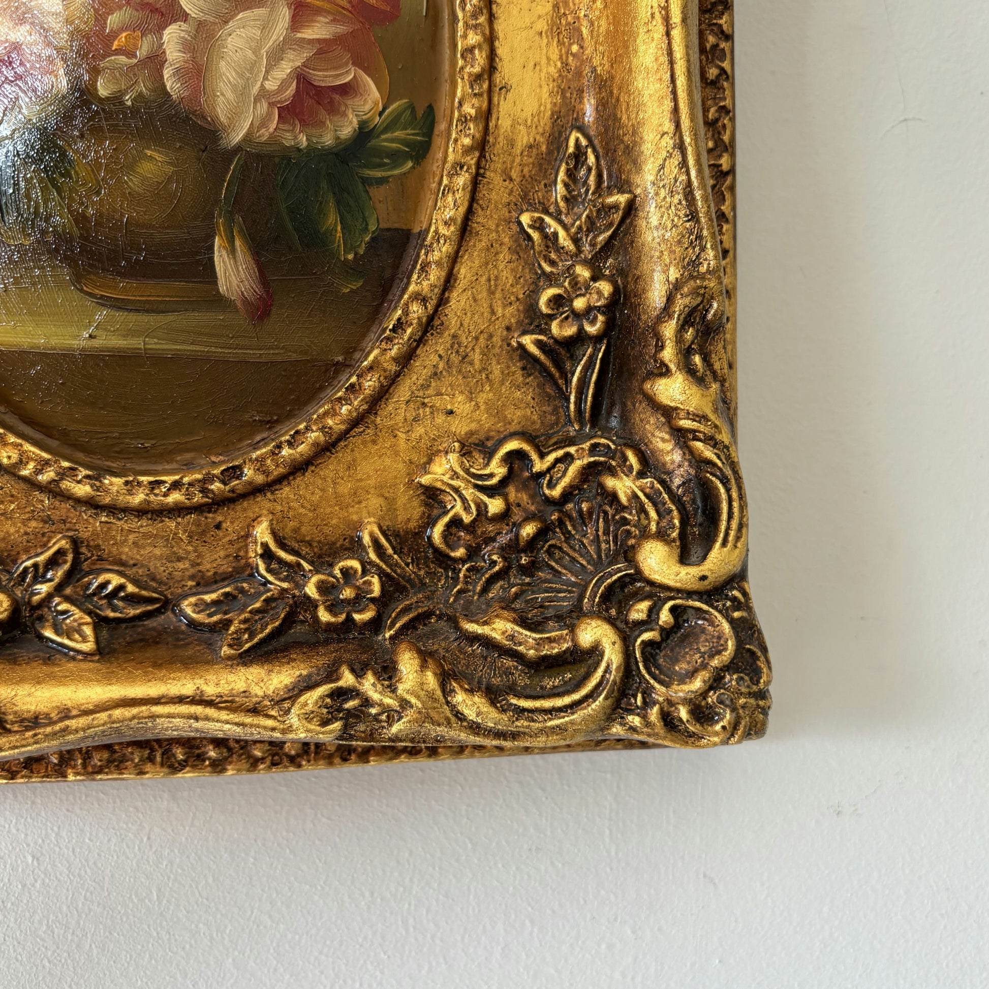 This is an authentic, hand-painted, original oil painting from the early 20th century, showcasing a classic still-life arrangement of lush white and pink flowers in a vase. The visible brushwork gives the surface a beautiful sense of texture and depth, capturing the richness of each petal and leaf. Nestled within an ornate, gold-toned frame, the painting’s vibrant colors and fine detail evoke timeless elegance. This one-of-a-kind artwork offers a unique glimpse into traditional artistry, making it a truly special addition to any collection.