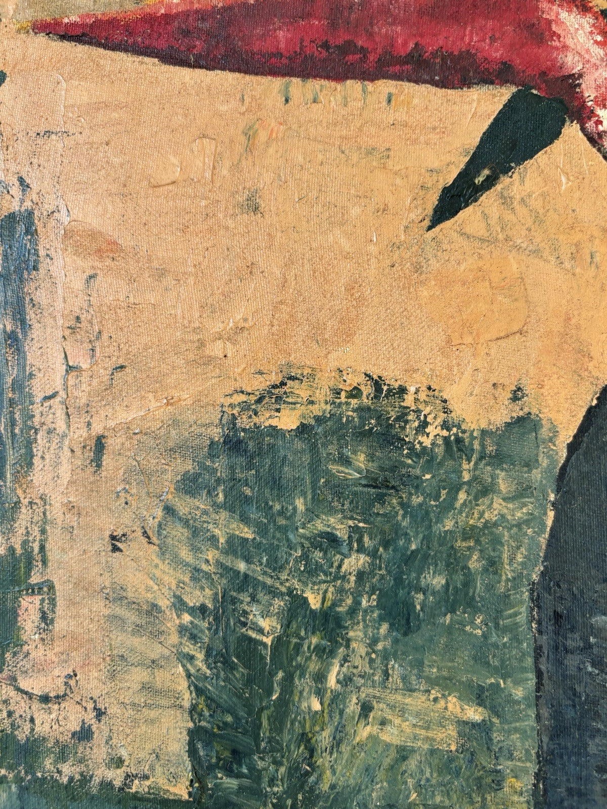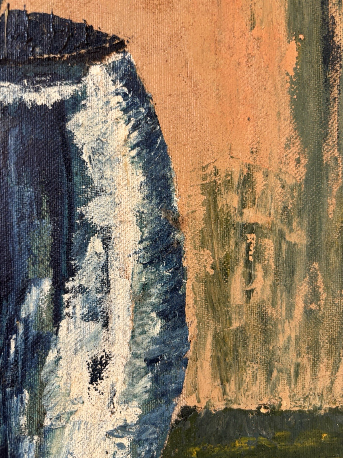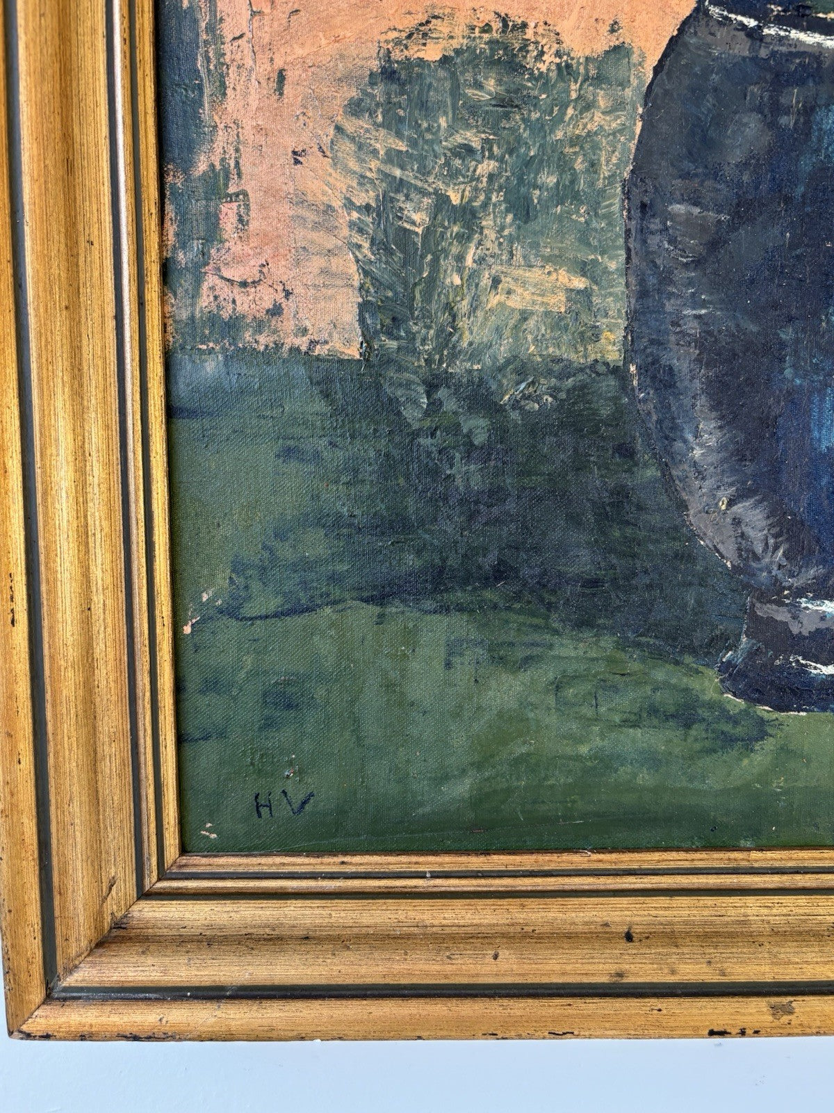 This vibrant vintage oil painting (ca. mid-20th century) presents a striking still life of tropical flowers arranged in a deep blue vase. The bold brushstrokes and warm color palette create a captivating contrast, giving the composition a lively, expressive character. A beautiful piece of mid-century art that brings warmth and color to any room.