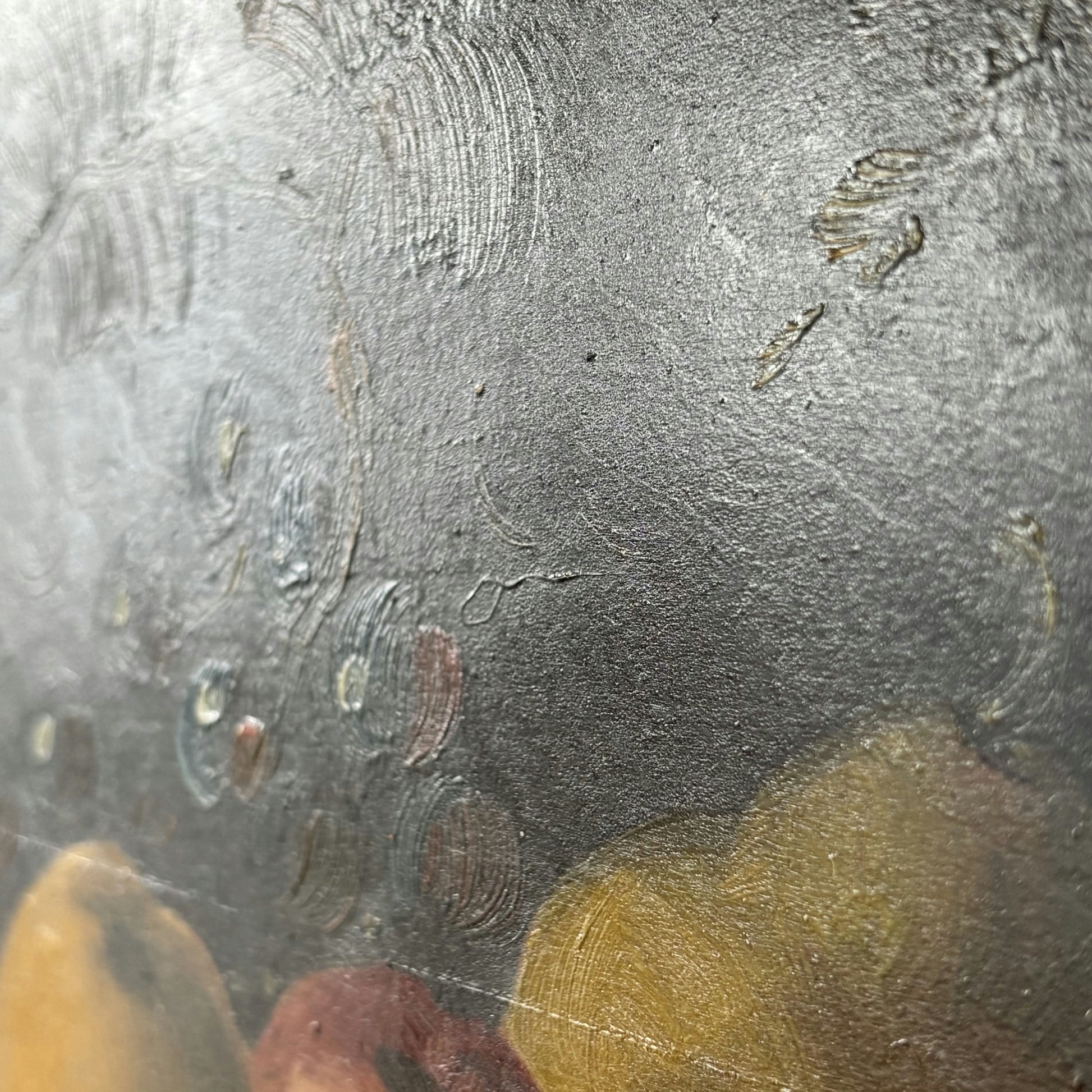 This is an authentic, hand-painted, original Oil Painting from the Mid 20th Century, showcasing a vibrant still life arrangement. The composition features bold red flowers in a green vase, surrounded by clusters of grapes, apples, a pear, and a sliced lemon resting on a richly colored tablecloth. The surface reveals expressive brushwork, particularly visible in the textured petals and rounded grapes, adding depth and character to the artwork. This one-of-a-kind piece offers a timeless presence and exemplifies the unique charm of traditional oil painting techniques.