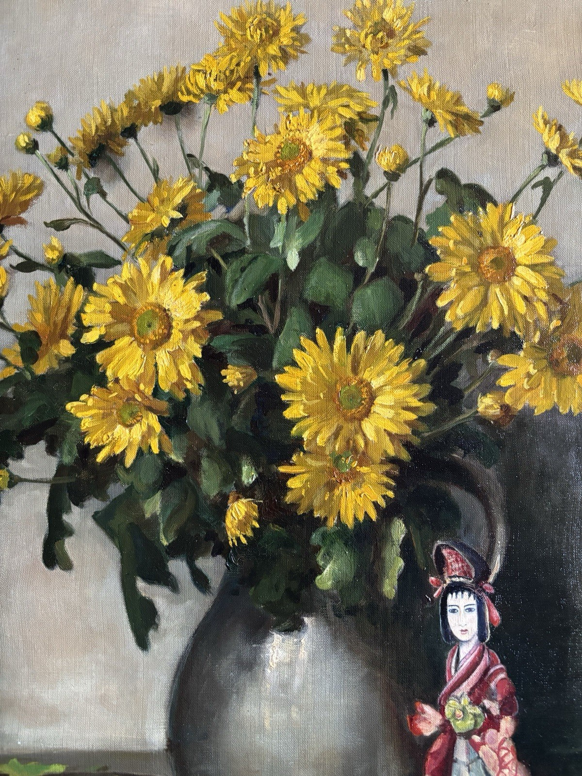 This large signed painting captures a vibrant bouquet of yellow flowers arranged in a silver vase, with a porcelain figurine and a glass bowl adding depth and charm. It is a wonderful example of Fleur’s style, decorative yet technically well executed.
