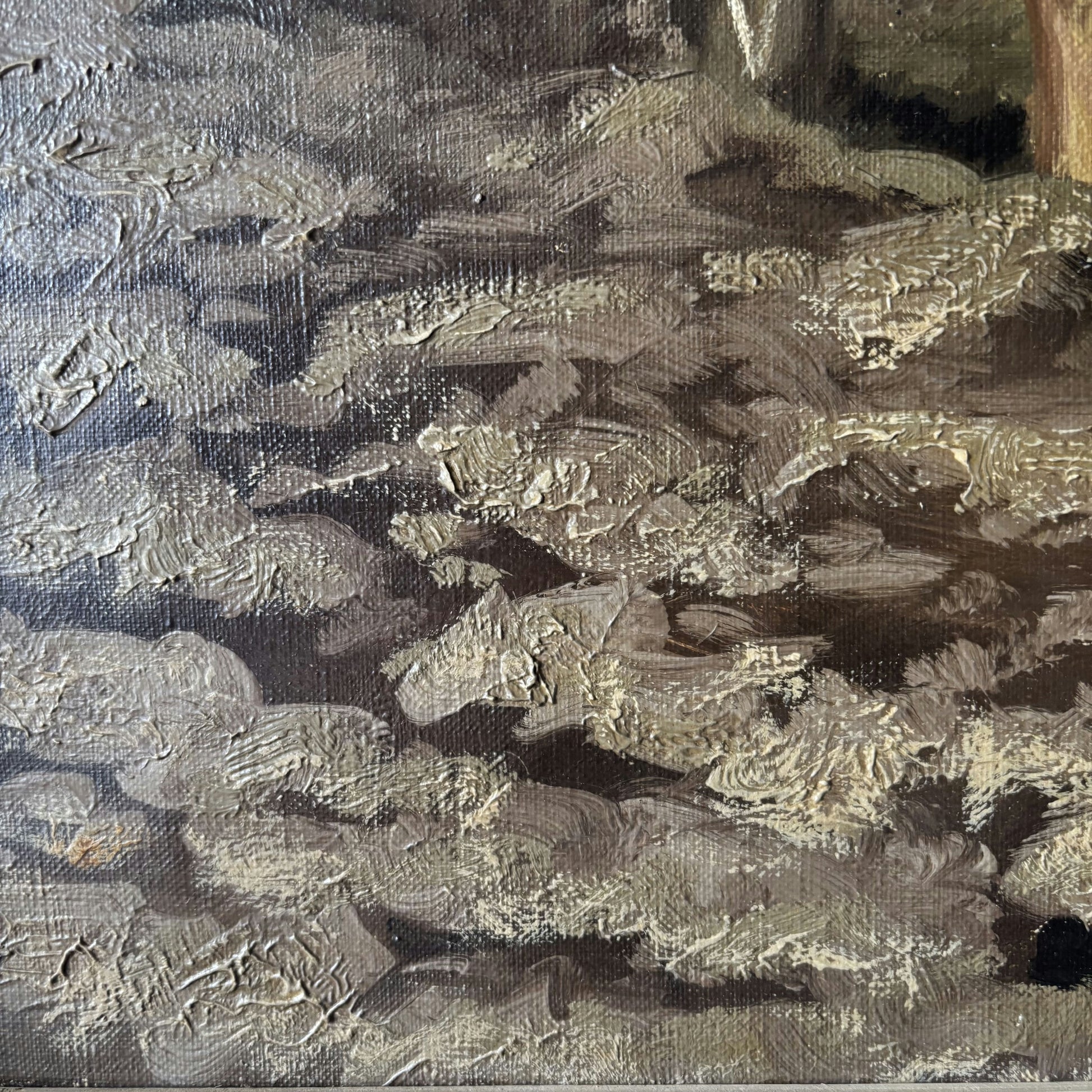 This authentic, hand-painted original oil painting, presumably from the early 20th century, beautifully depicts a traditional rural scene of a farmer guiding two strong horses as they plow a vast field beneath a sky dotted with soft clouds. The richly textured brushwork creates a striking sense of movement and depth in the earth and horses, showcasing the artist’s careful attention to surface and detail. Visible close-ups reveal expressive, layered strokes that give the soil and animals a vivid, lifelike quality, further emphasizing the unique, artisanal character of this work. As a one-of-a-kind piece, this oil painting offers a timeless celebration of pastoral life, ideal for collectors seeking authentic and original artwork.